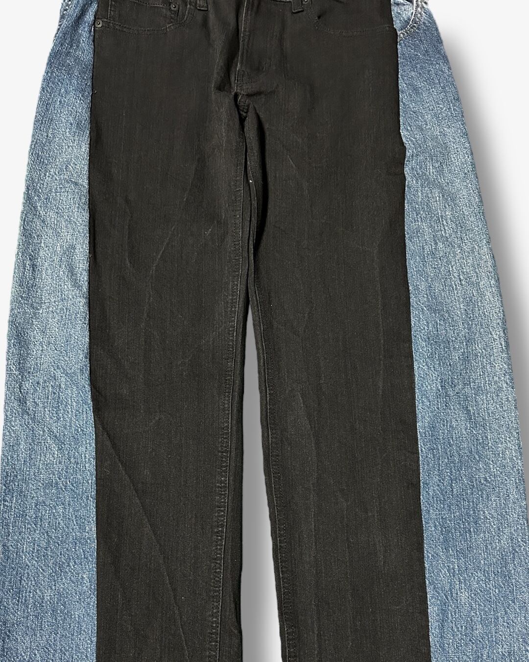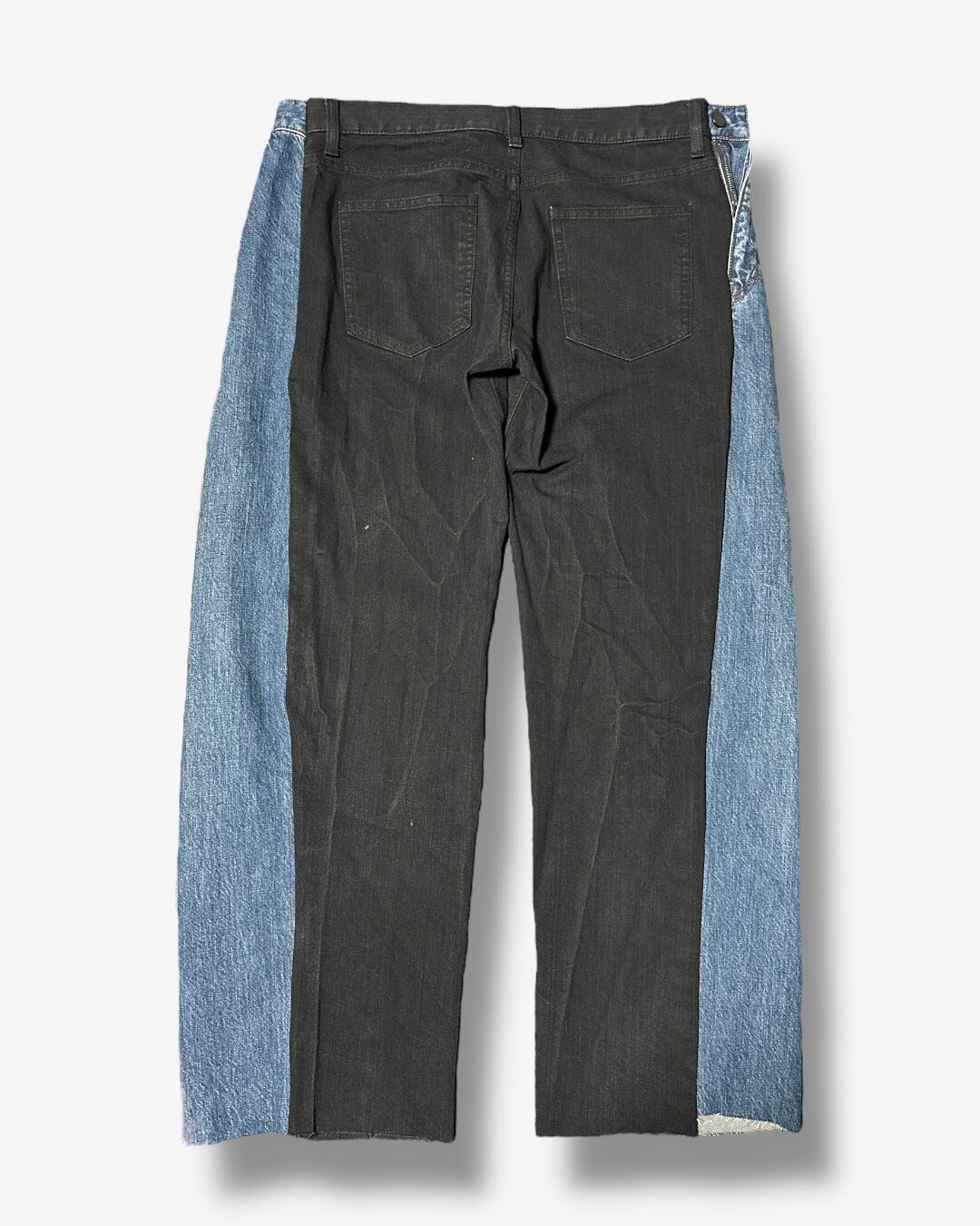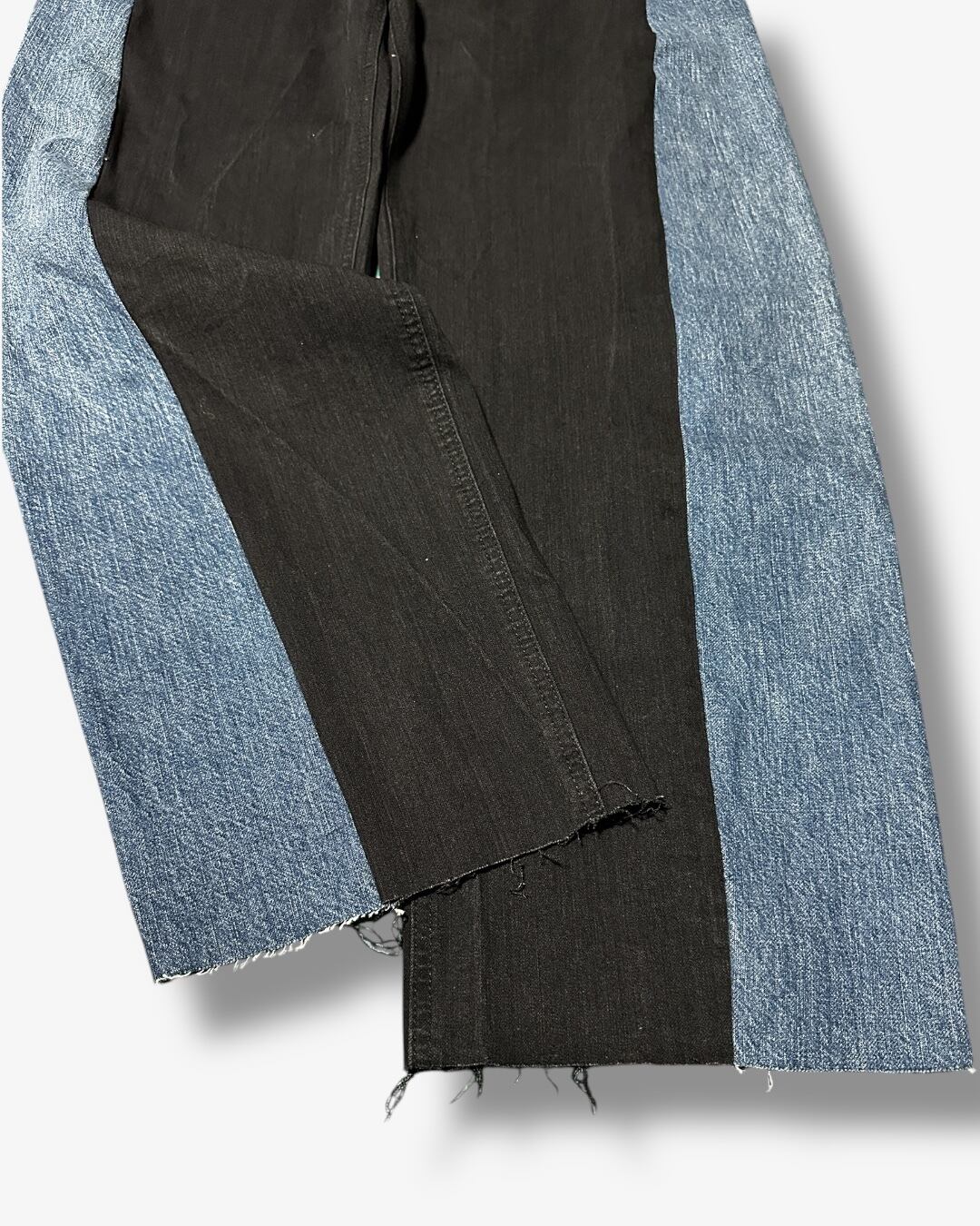 メインとなるブラックデニムの両サイドを大胆にカットし、ヴィンテージブルーのデニムをドッキング。カラーと質感のコントラストが際立つ、唯一無二のリメイクパンツです。