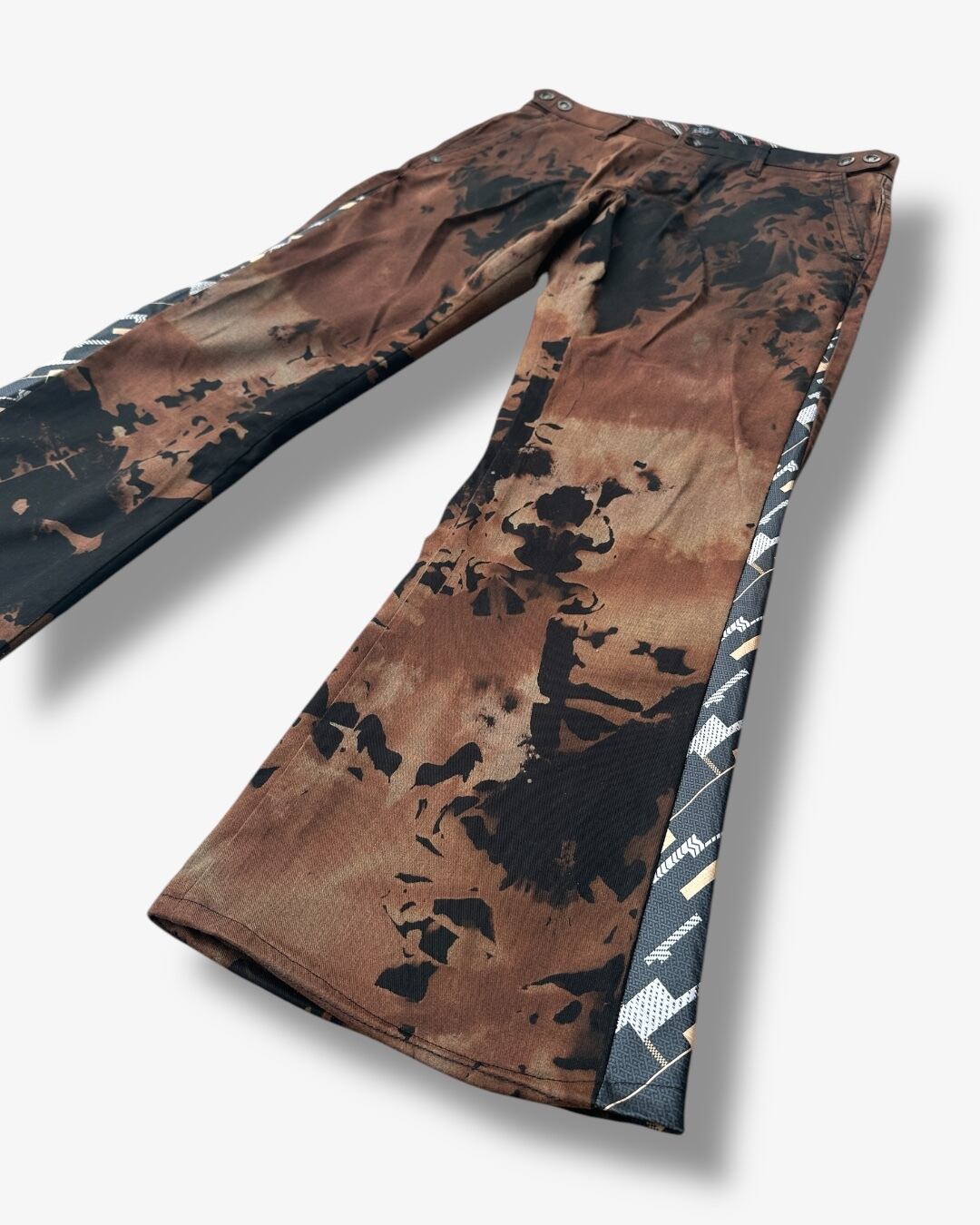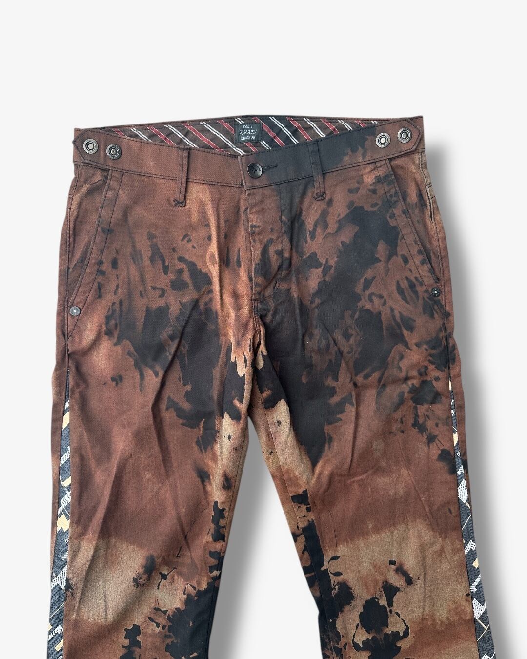 ブラックデニムを大胆にブリーチで脱色し、ランダムな柄を施したアートのような一本。左右のサイドには、ブラックをベースにゴールド&シルバーの柄が施されたネクタイをドッキング。光の加減でさりげなく煌めく、ラグジュアリーなアクセントをプラスしています。