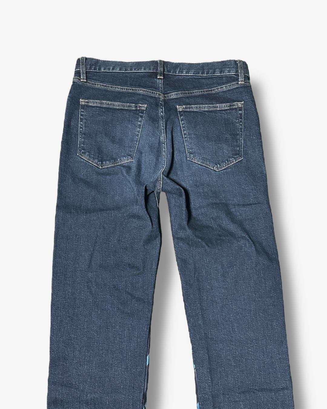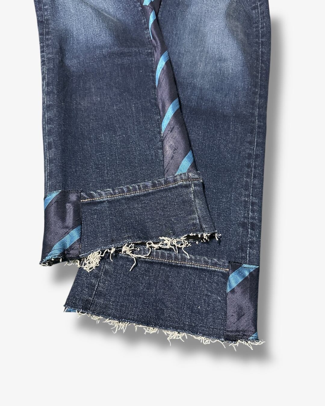 デニムサイドに沿ってネクタイが配置され、縦のラインを強調することで脚長効果を演出。