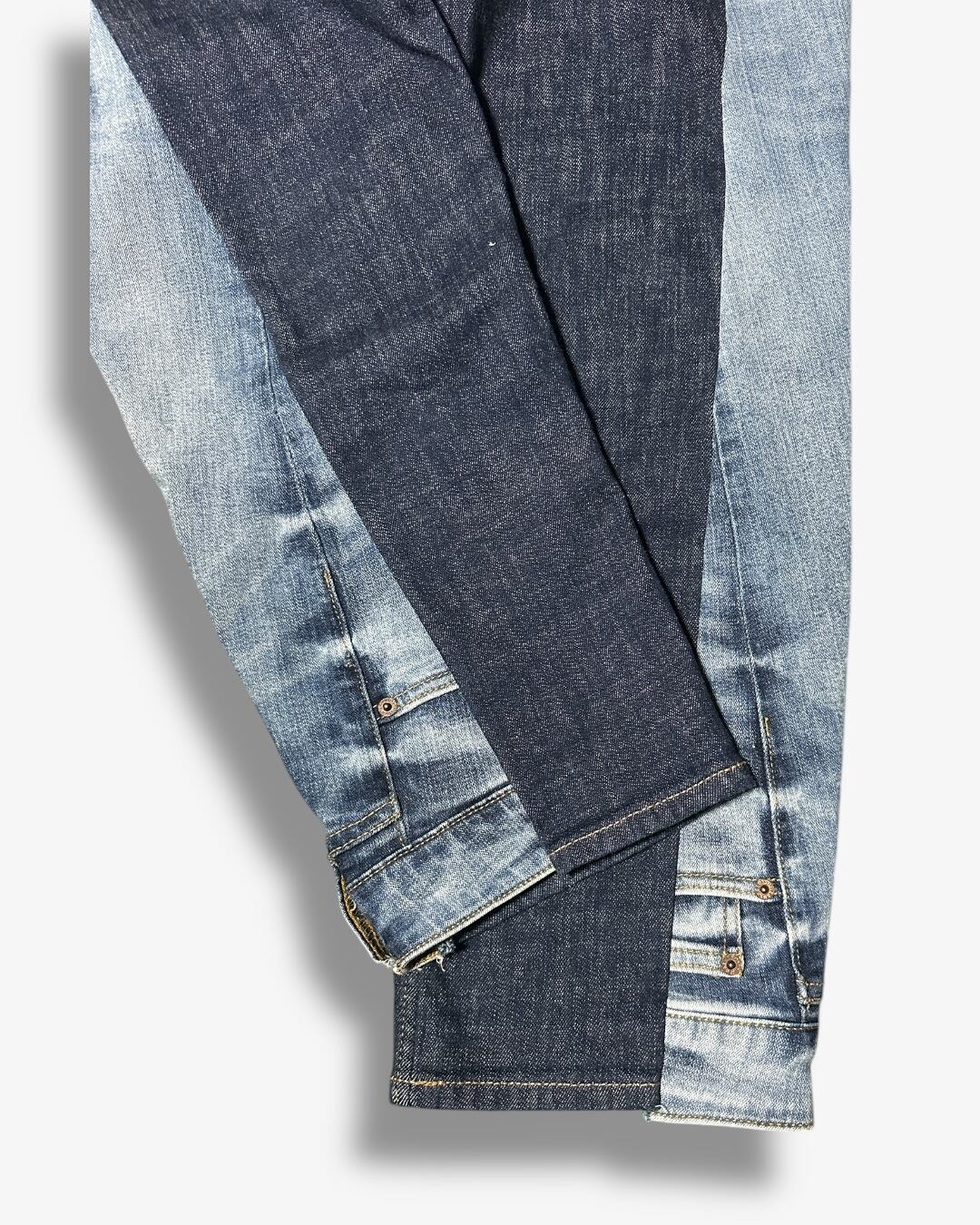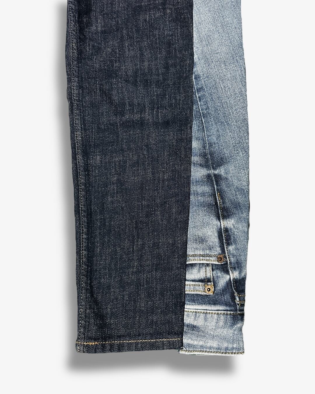 ベースのパンツのサイドを開き、異なるトーンのデニムを加えることで、視覚的にも楽しめるバイカラーストレートパンツに仕上げました。