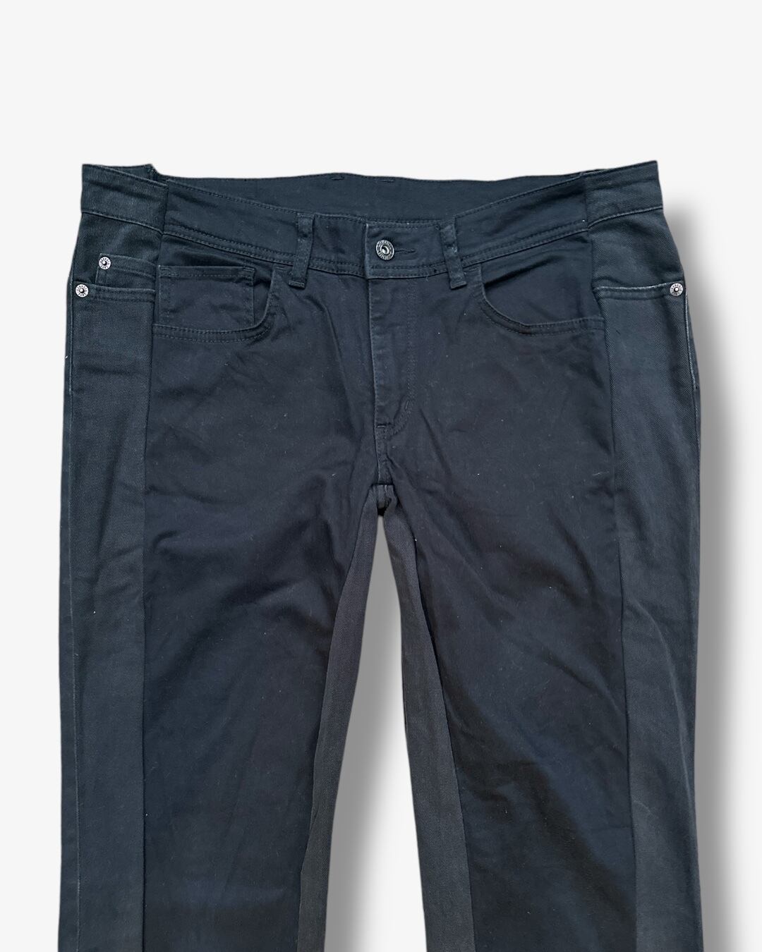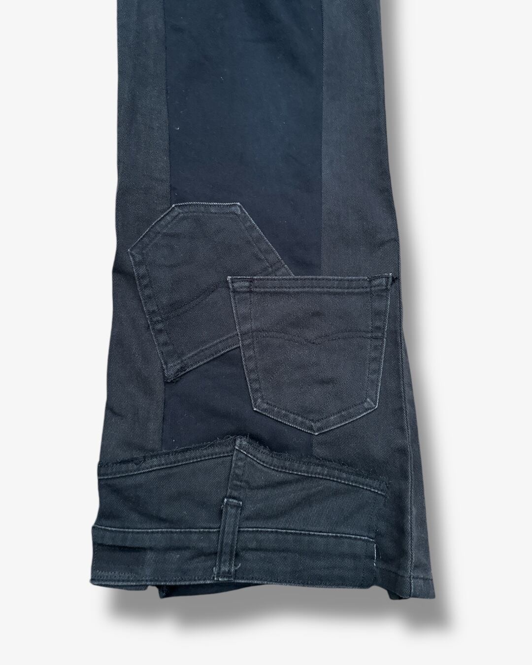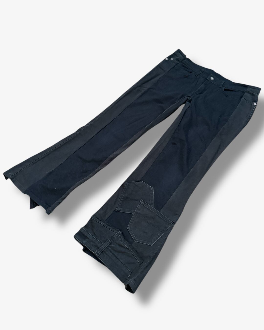 2本のブラックパンツを再構築し、ディテールに遊び心を込めたリメイクアイテム。