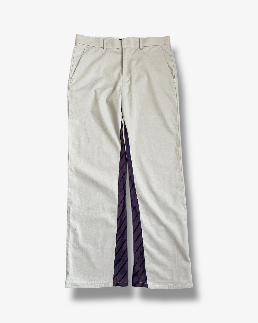 フォーマルな印象のベージュスラックスに、内側からボルドーのネクタイ生地をドッキング。さりげなく歩いたときに覗く色気が、上品さと個性を絶妙なバランスで引き立てます。