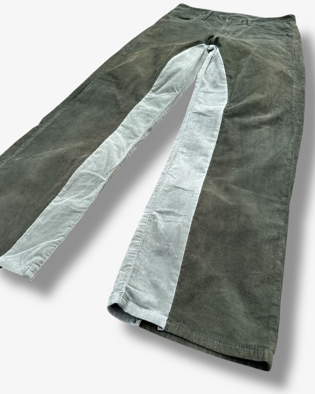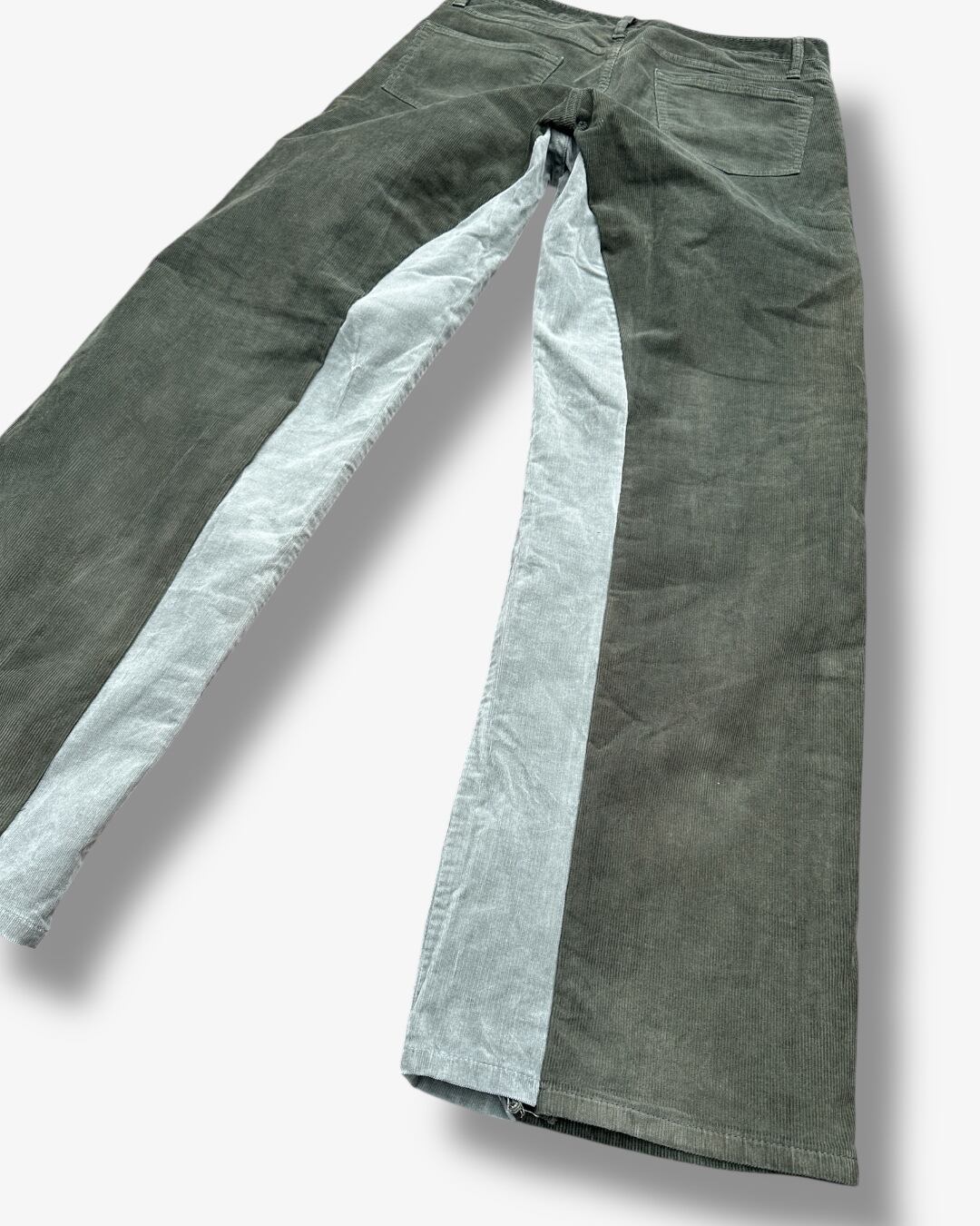 2本のコーデュロイパンツを巧みに再構築した、唯一無二のリメイクワイドパンツ。深みのあるグリーンのグラデーションが視覚を惹きつけ、ただのパンツとは一線を画すインパクトを放ちます。