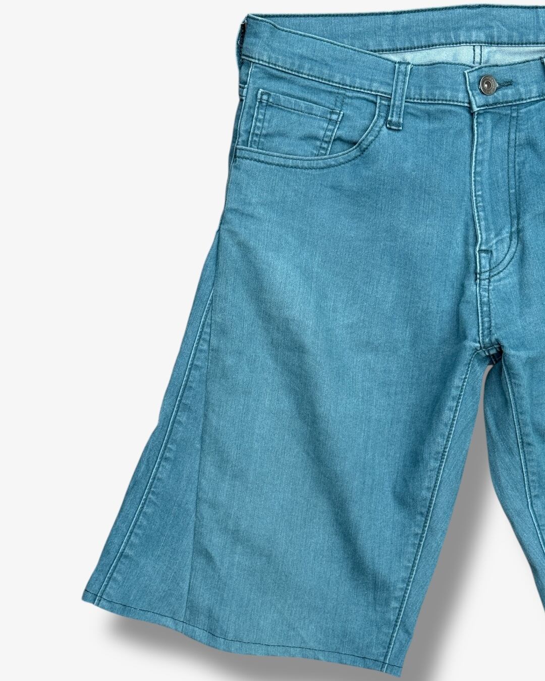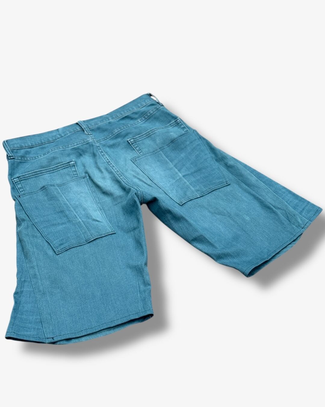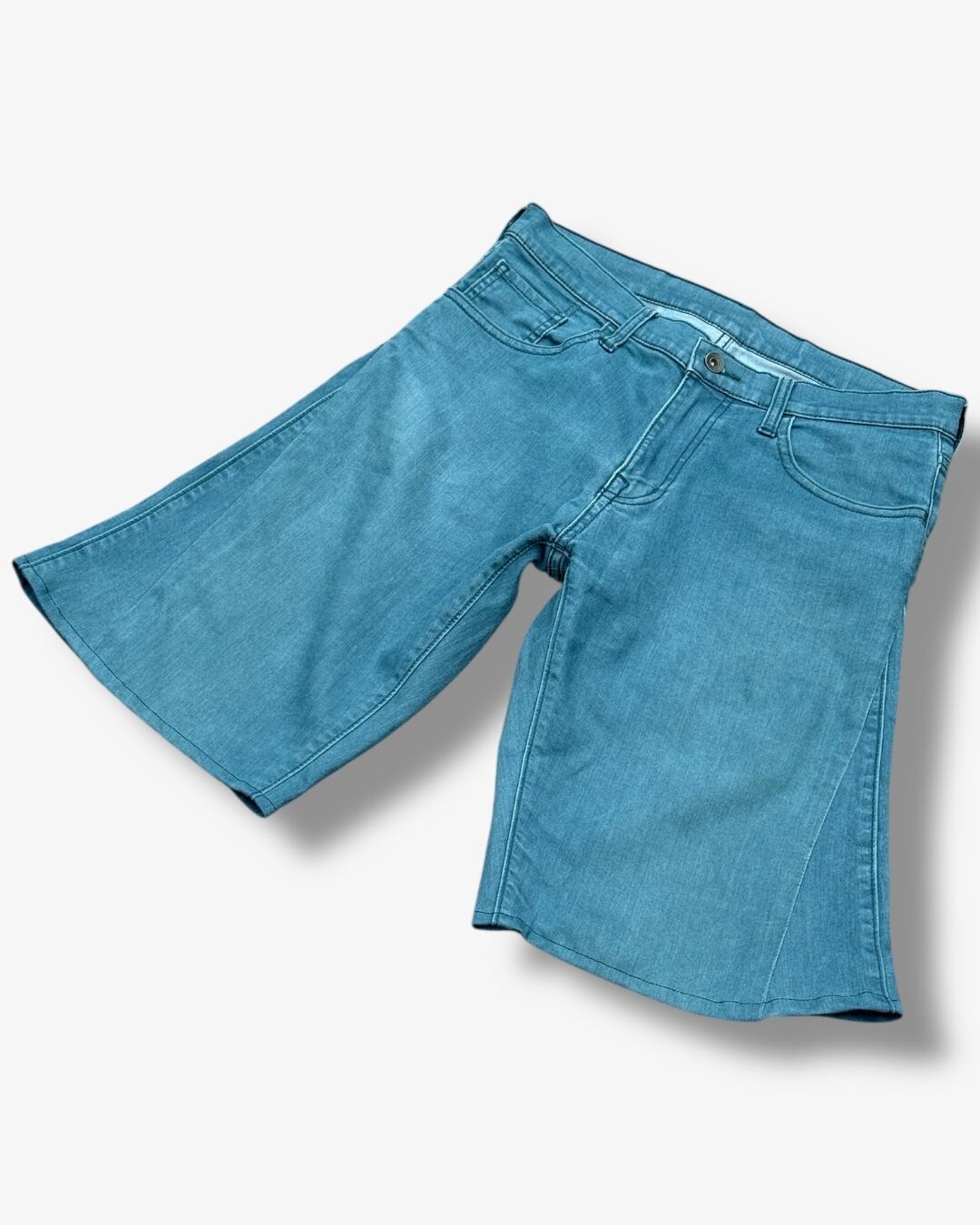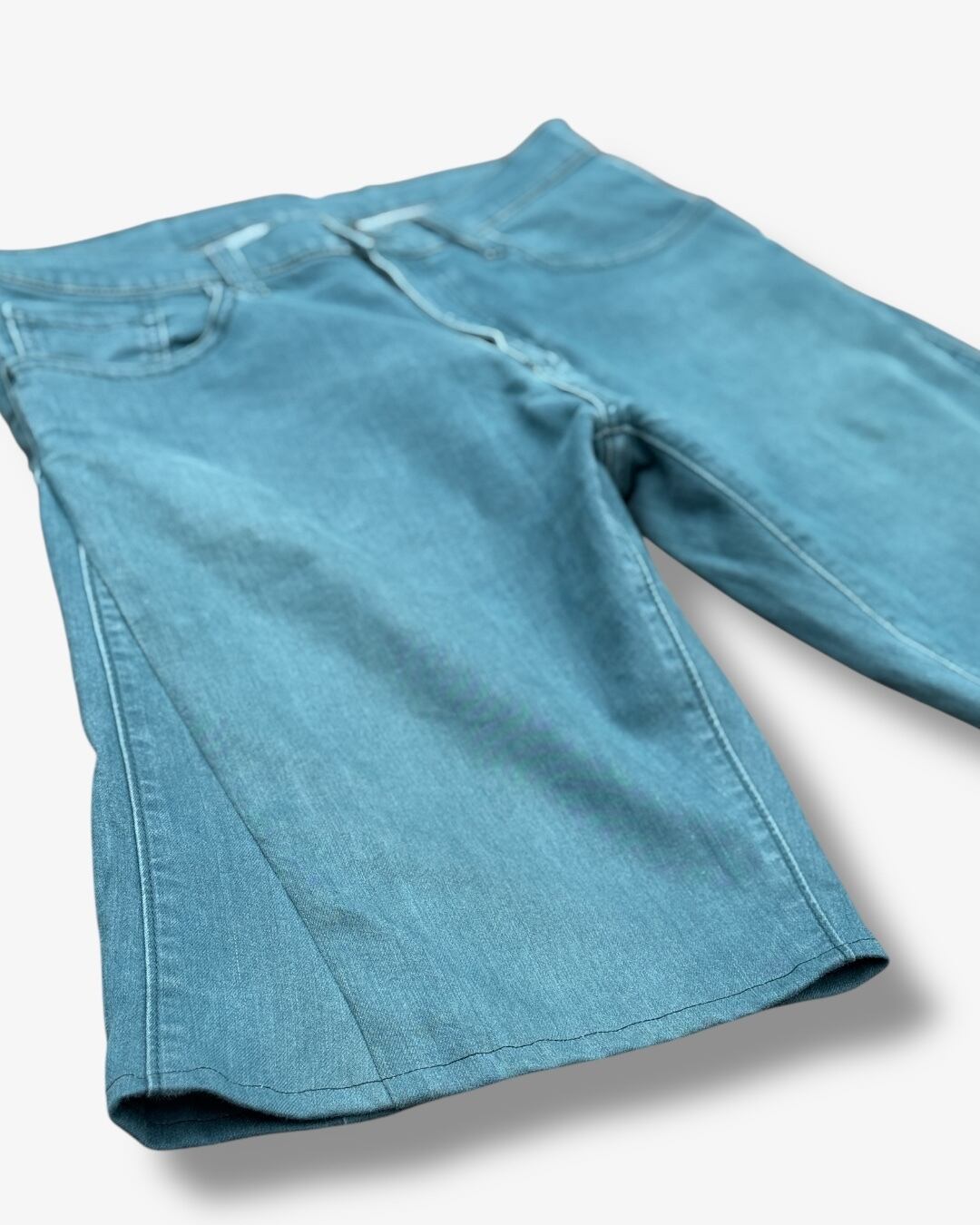 ブルーのストレートパンツを解体し、新たにフレアがかったハーフパンツとして再構築しました。