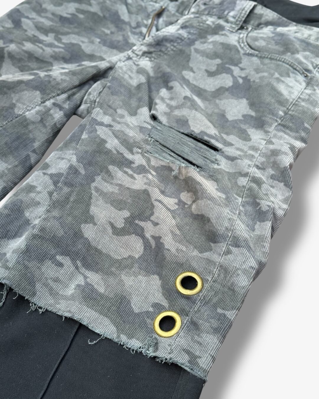 コーデュロイパンツをカットしハーフ仕様にリメイク、さらに別パンツをドッキングしたレイヤードデザイン。