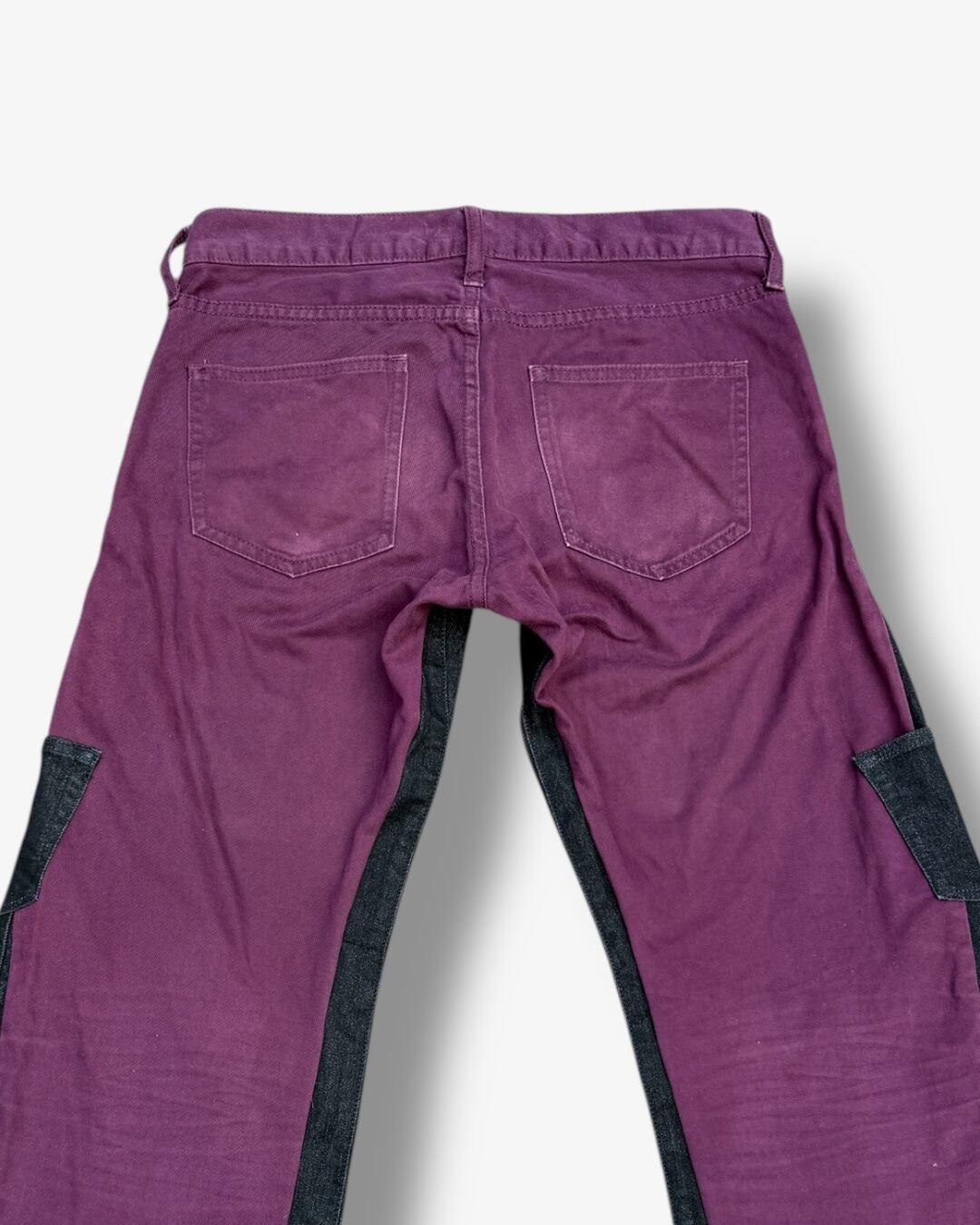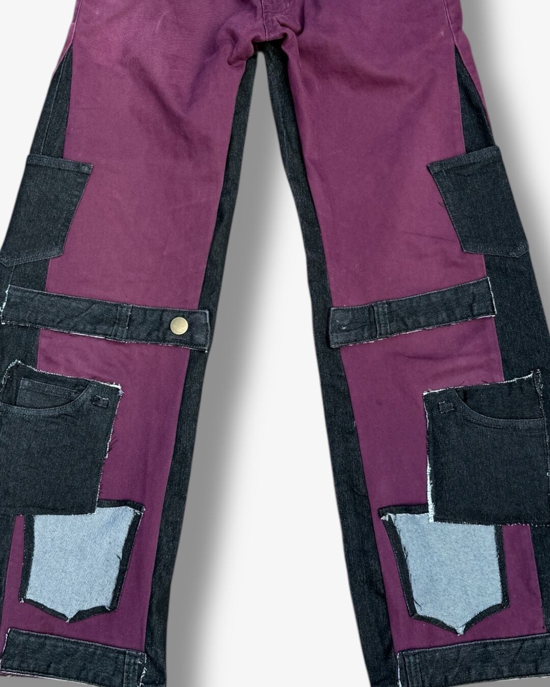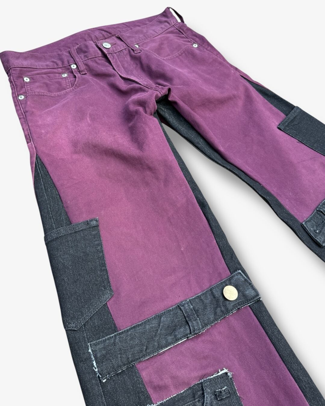 ワインレッドのチノパンツをベースに、ブラックデニムを解体してパーツごとに再構築したリメイクパンツ。
