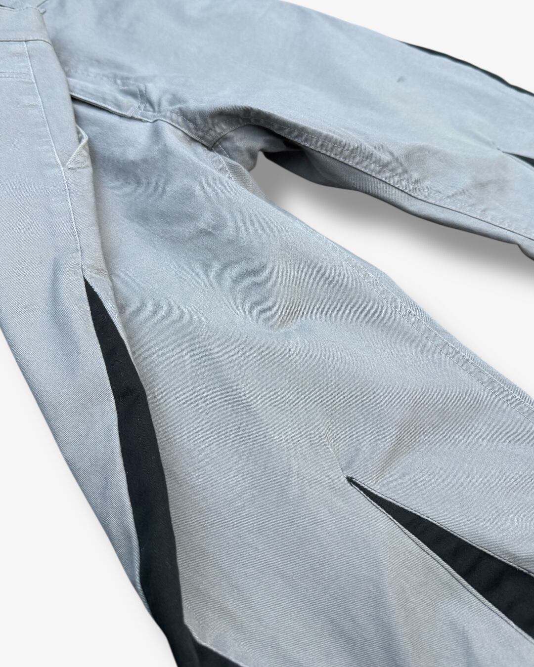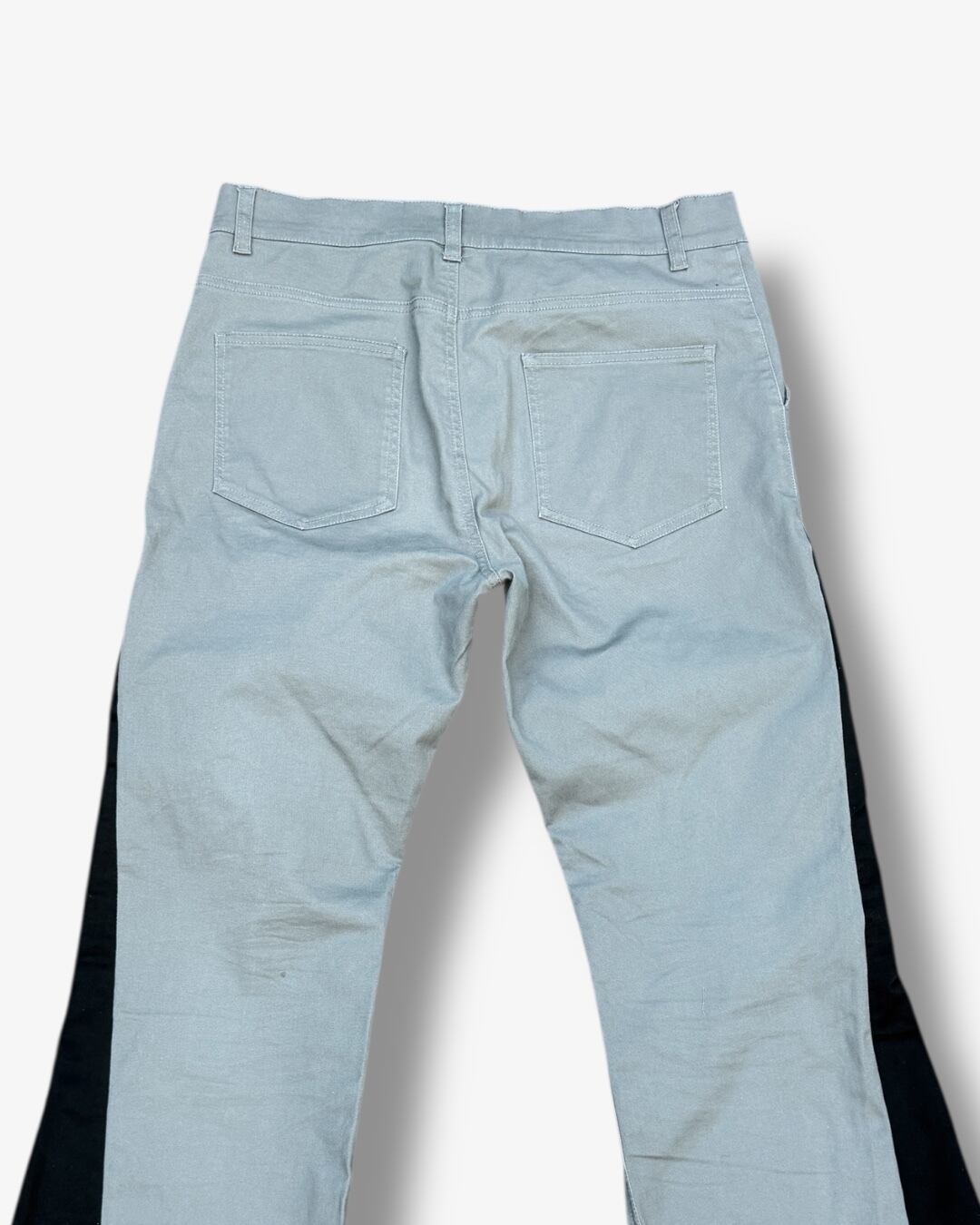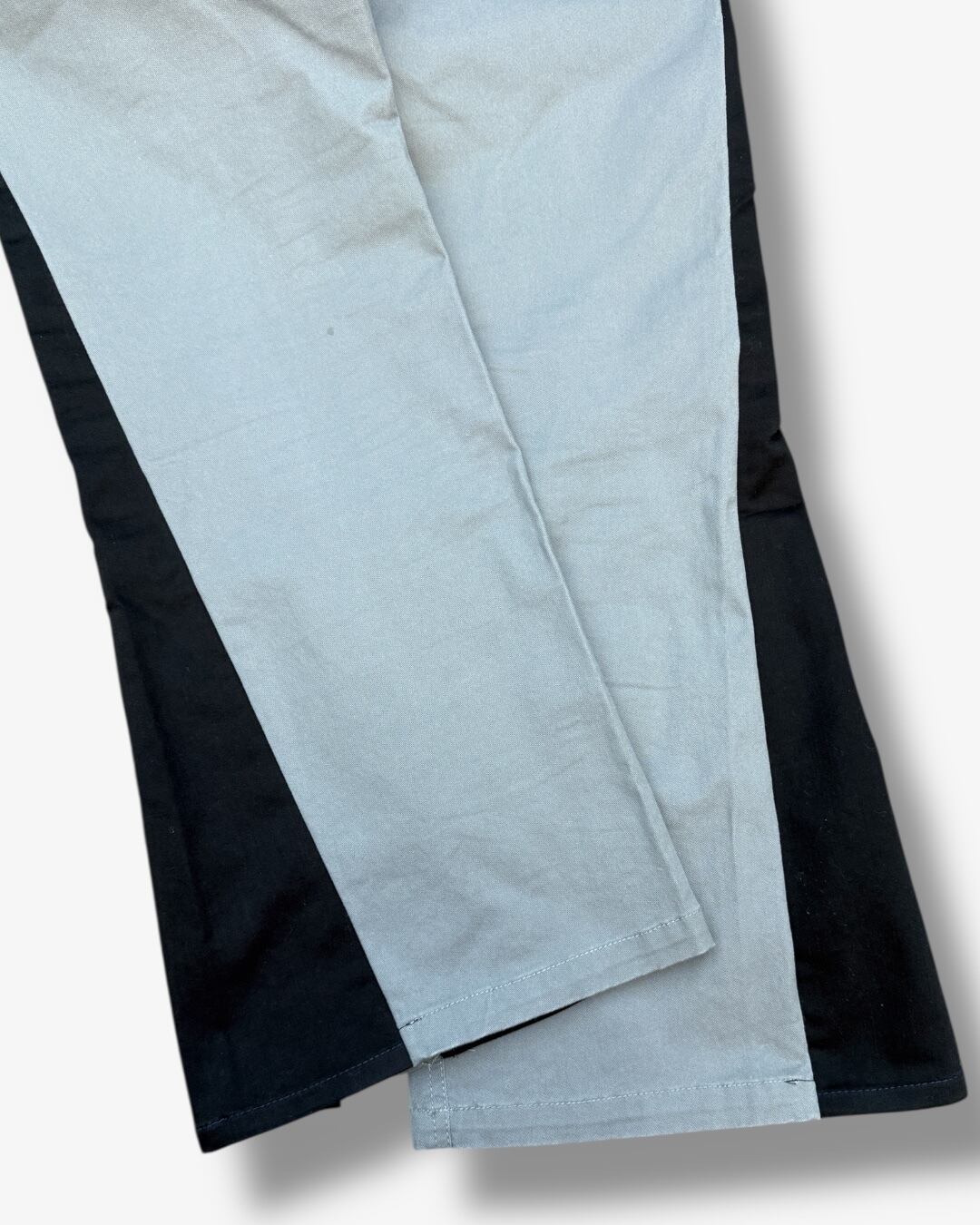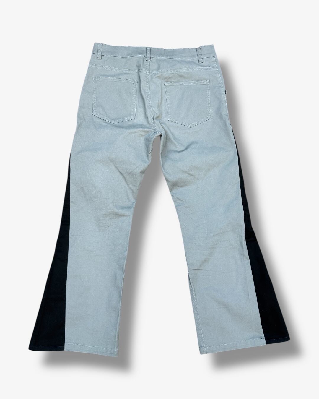 グレーカラーのパンツをベースに、サイドへブラックの生地をドッキングしたフレアパンツ。