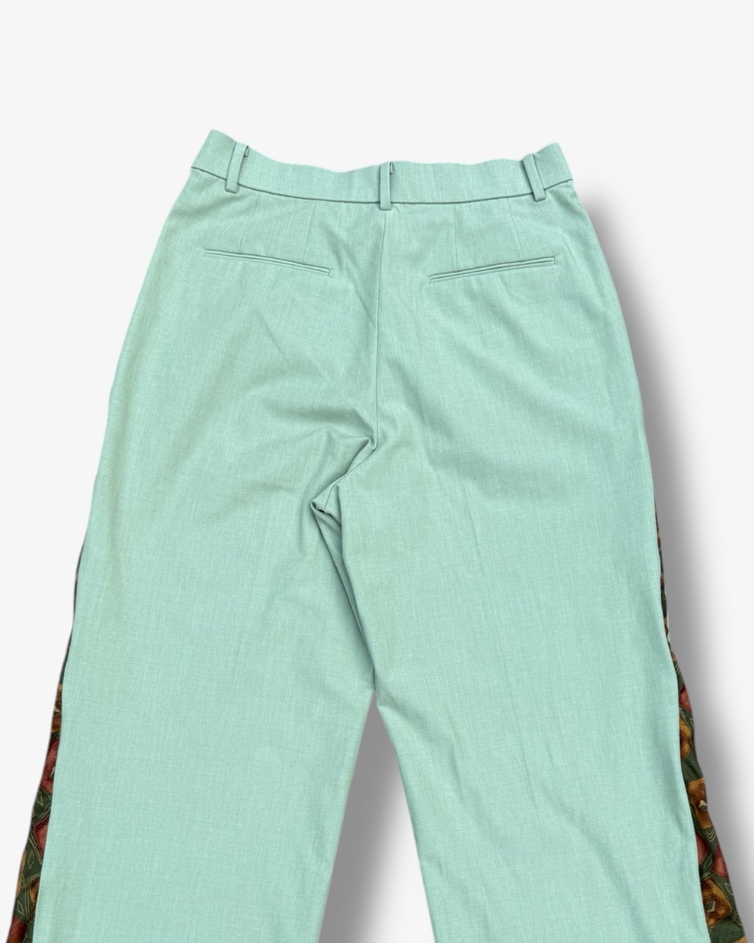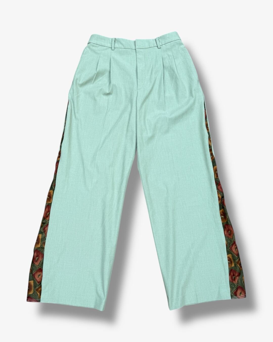 エメラルドグリーンのスラックスをベースに、グリーン系のネクタイ生地をドッキングしたワイドパンツ。
