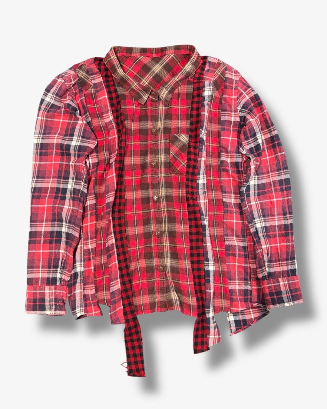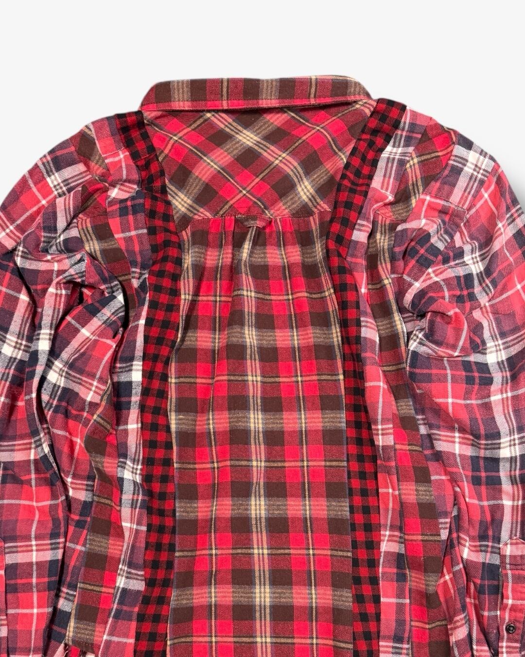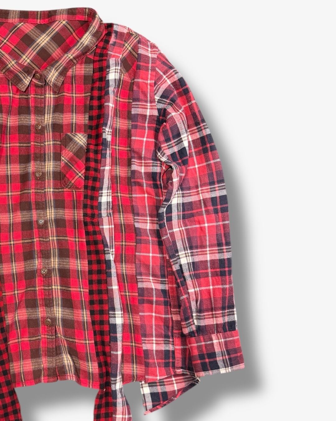 ヴィンテージネル3着を解体し、パターンごとに再構築。クラシックなチェック柄を、アシンメトリーなバランスで再編成した一点モノ。