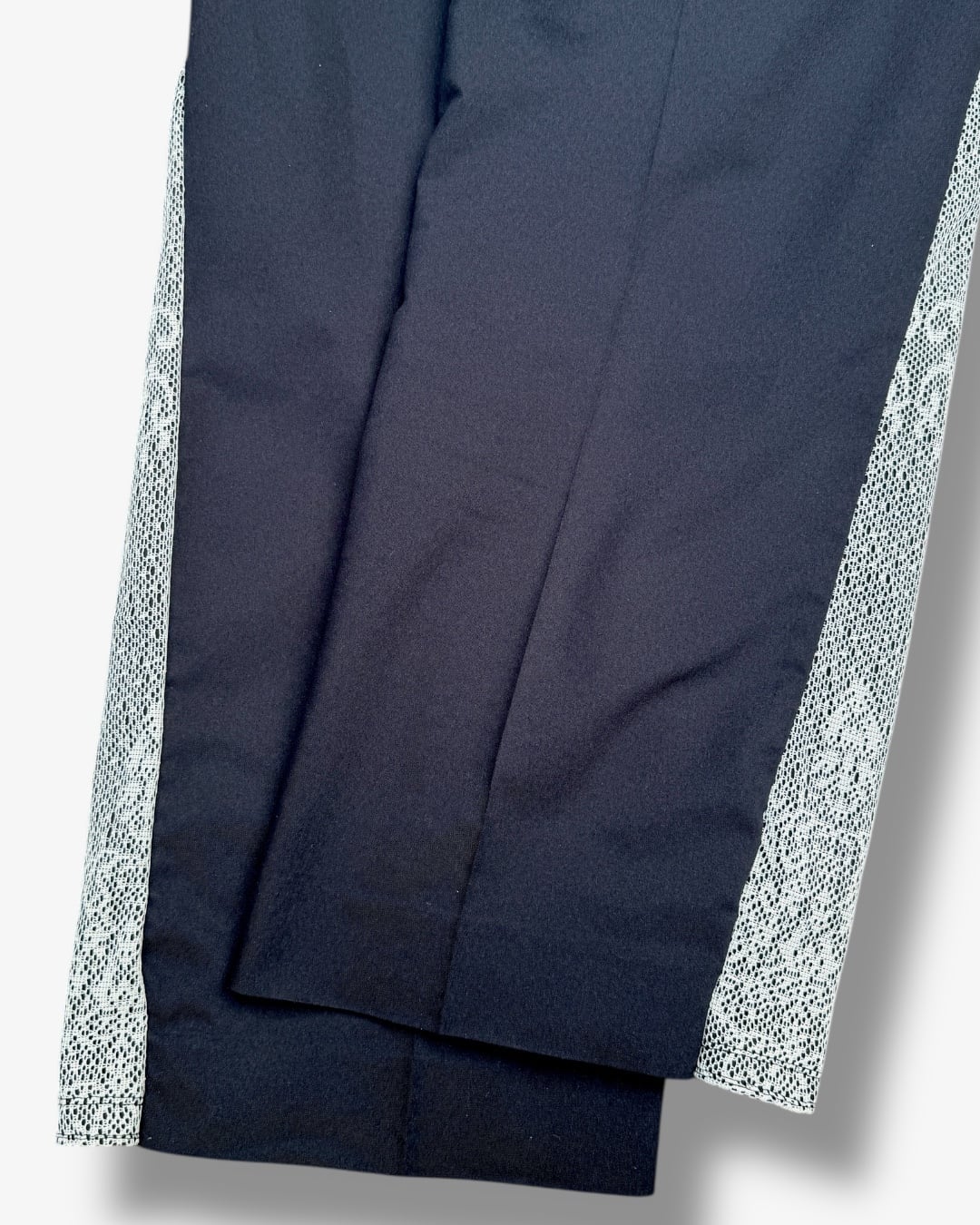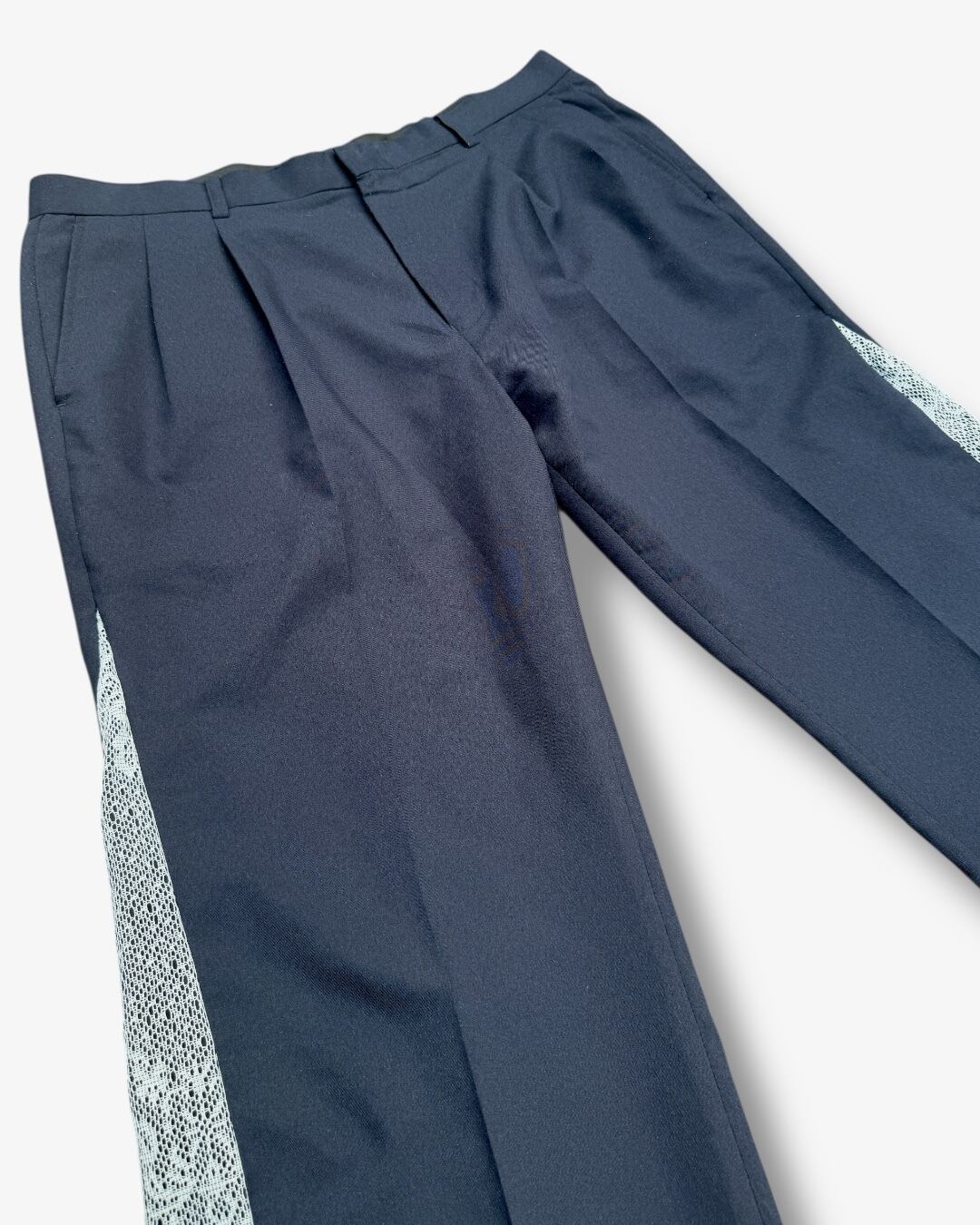 ネイビーのスラックスのサイドに、繊細なレース生地を縫い合わせたリメイクアイテム。