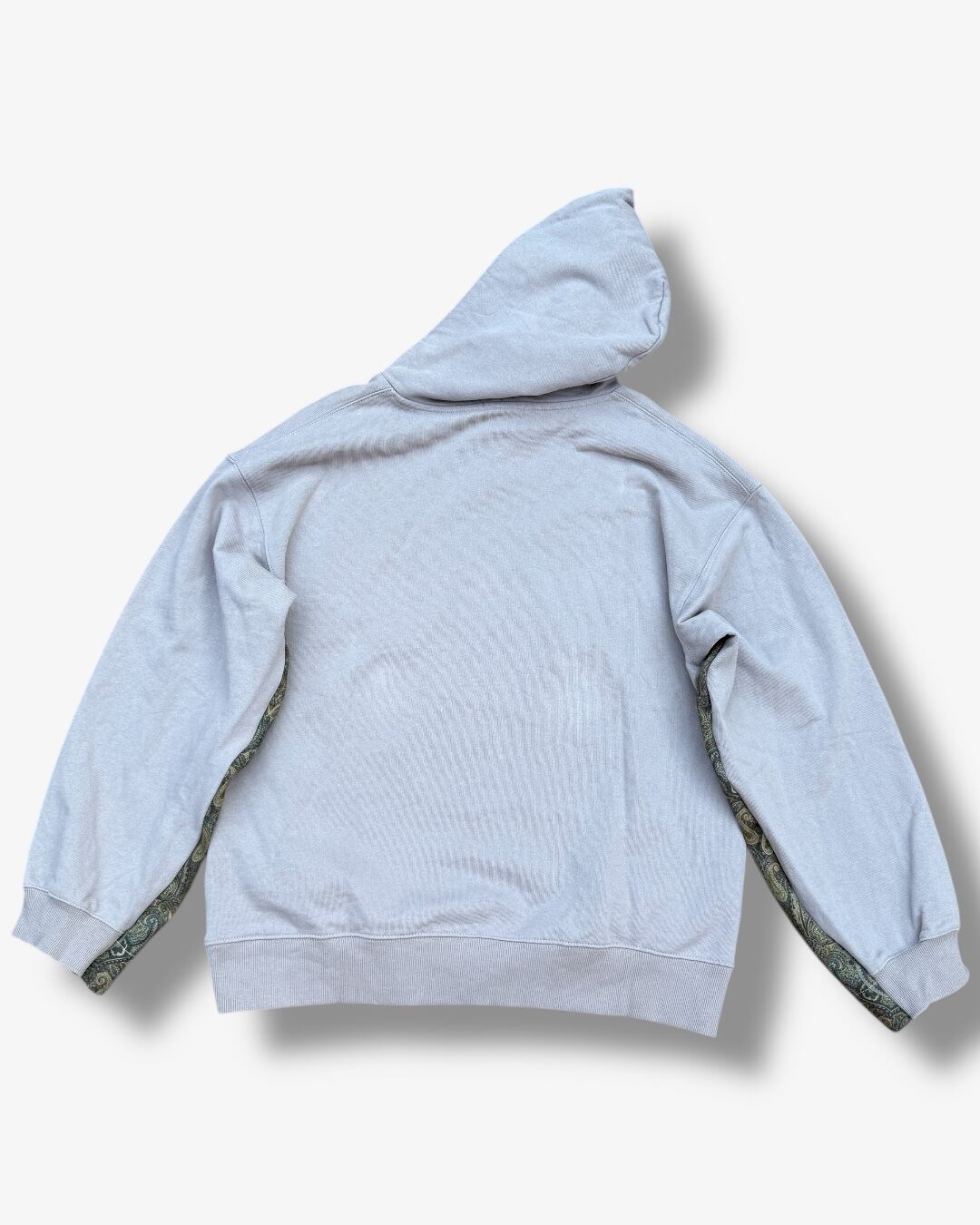 シンプルなグレーフーディーに、袖下へペイズリー生地をドッキングした一点物のリメイクアイテム。