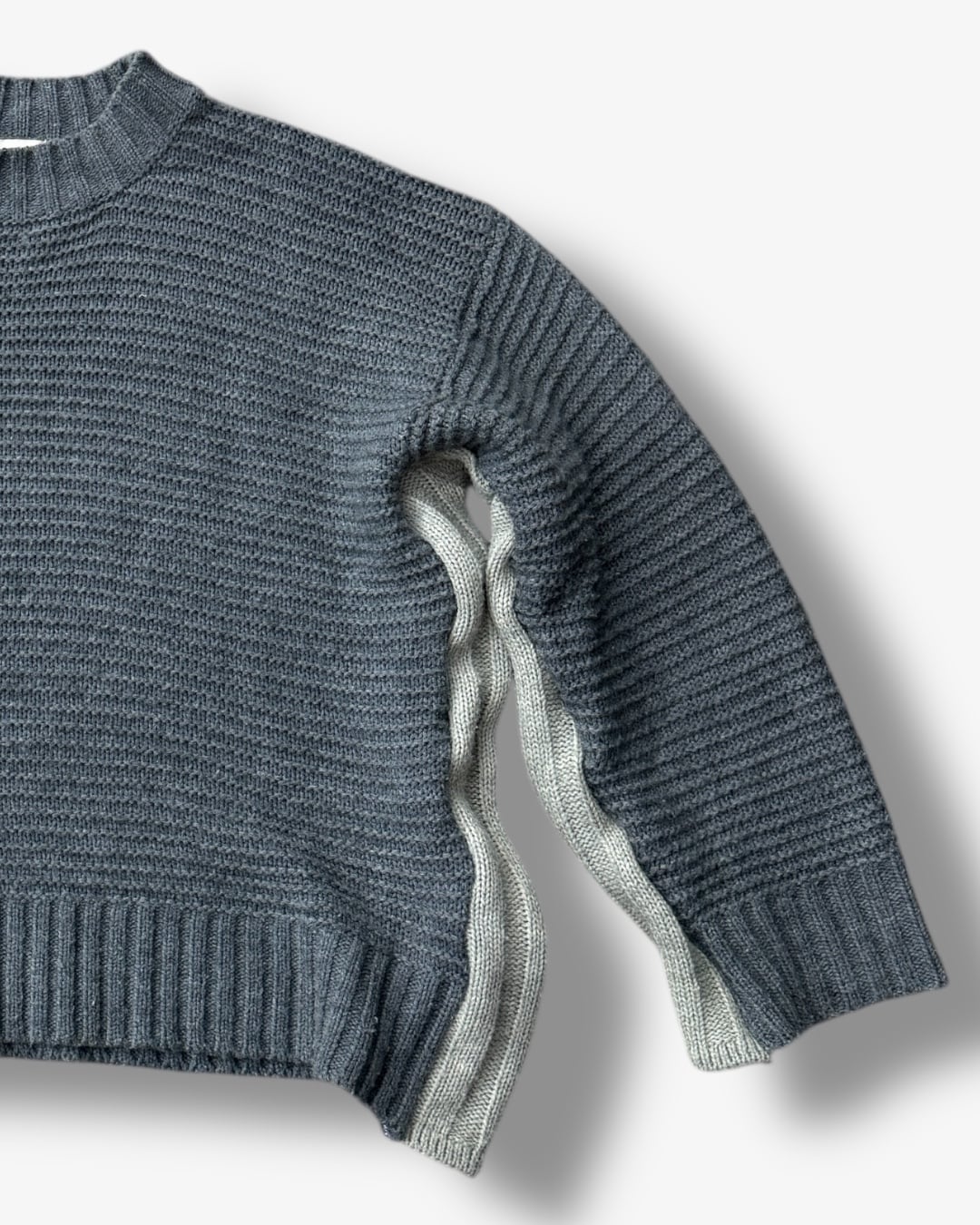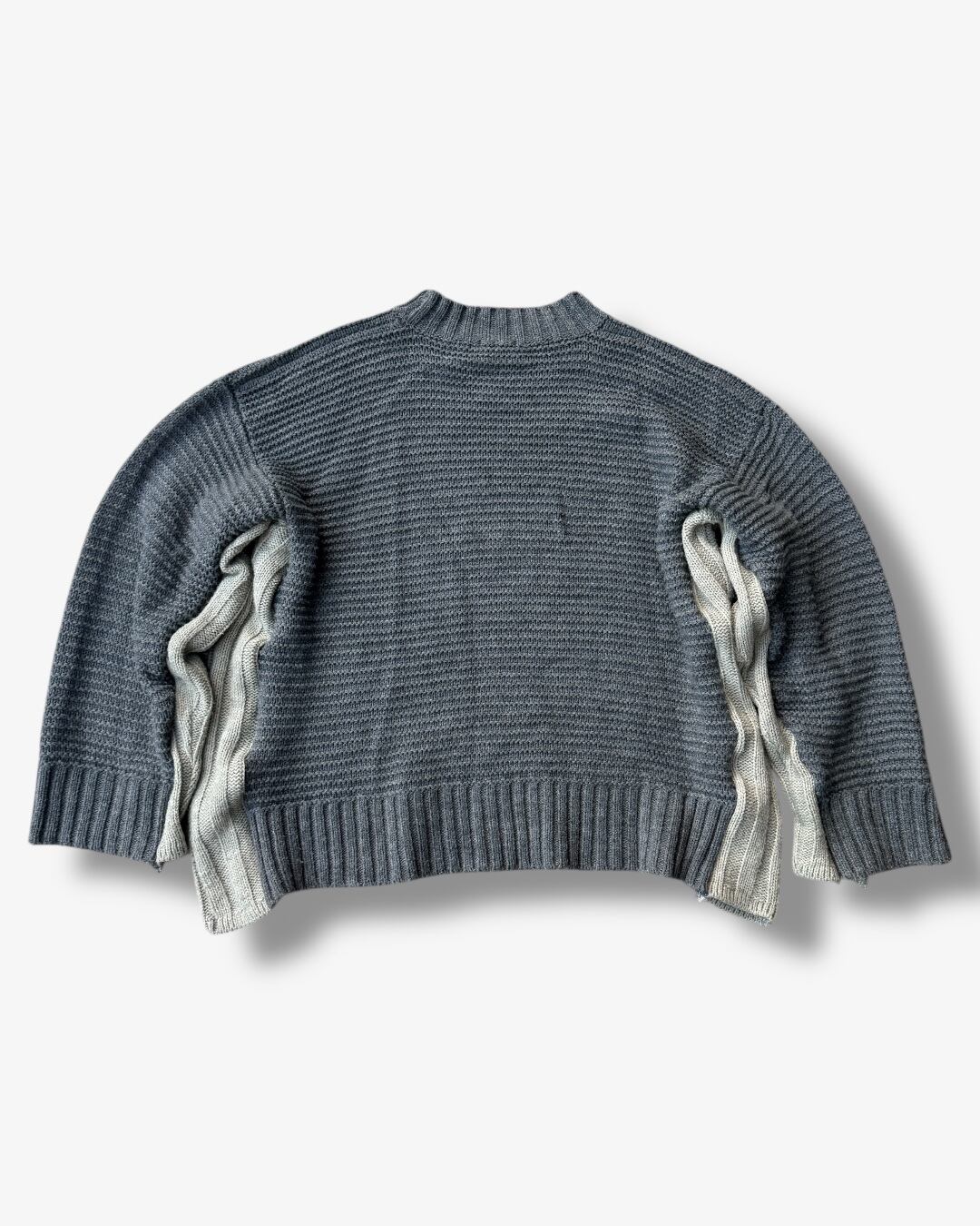 畦編みニットをベースに、両脇から袖内側へ異なるニットをドッキングしたリメイクトップス。