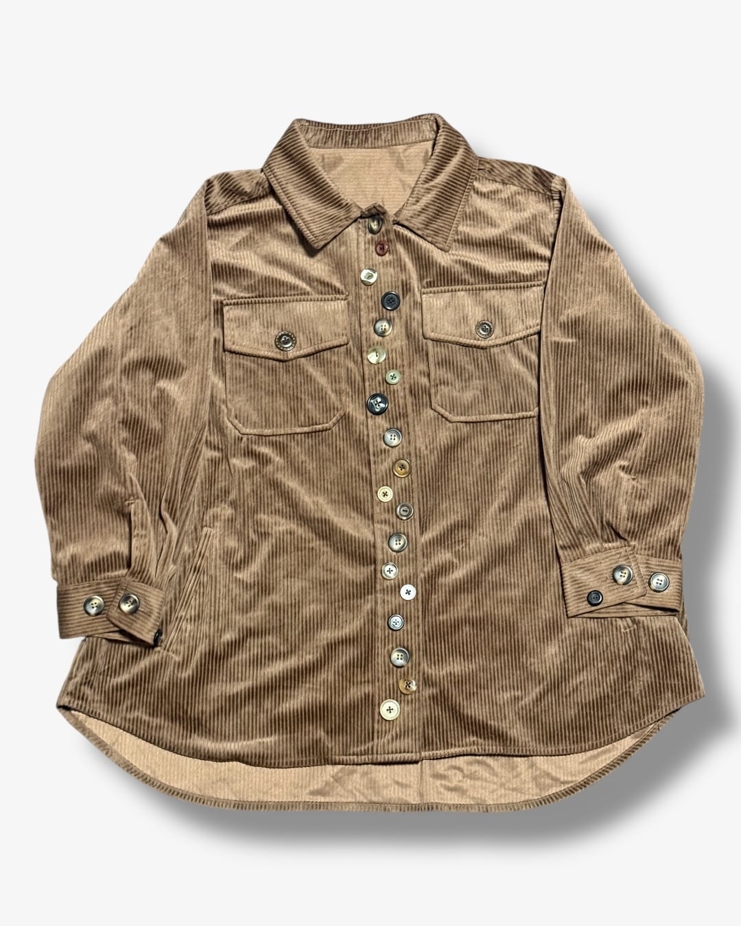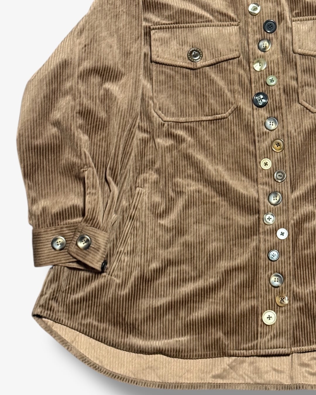 ベージュのコーデュロイシャツをベースに、異なる色・サイズのボタンをフロントにランダム配置。