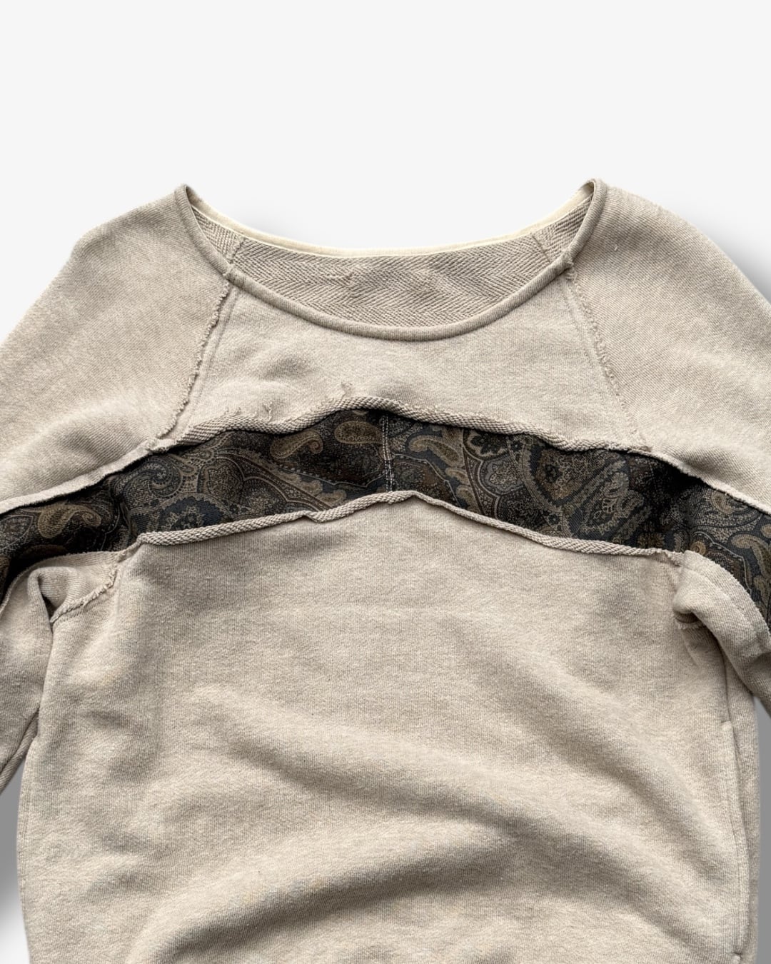 胸元から袖にかけてペイズリー柄が覗くデザインで、シンプルなスウェットに立体感のあるアクセントを加えました。