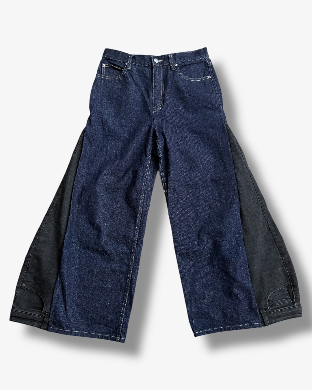 インディゴデニムにブラックデニムをドッキングしたリメイクパンツ。