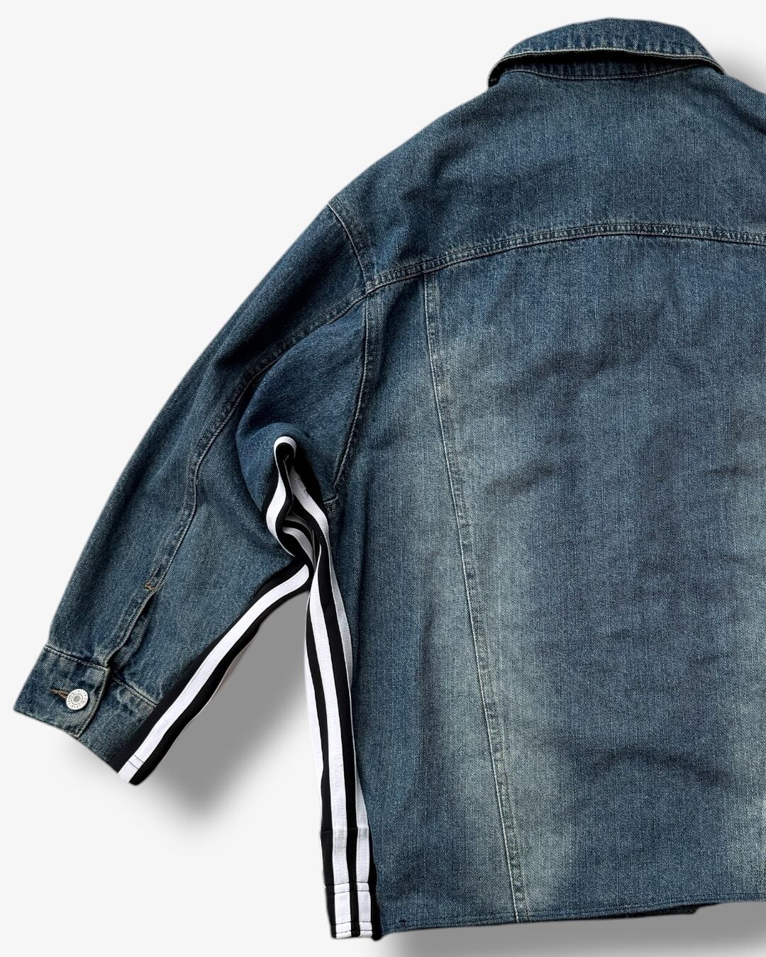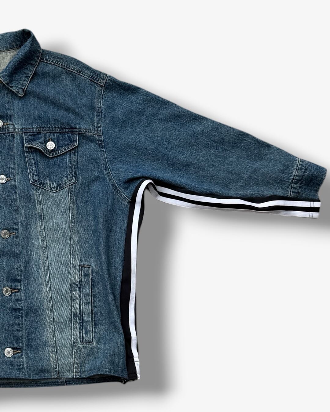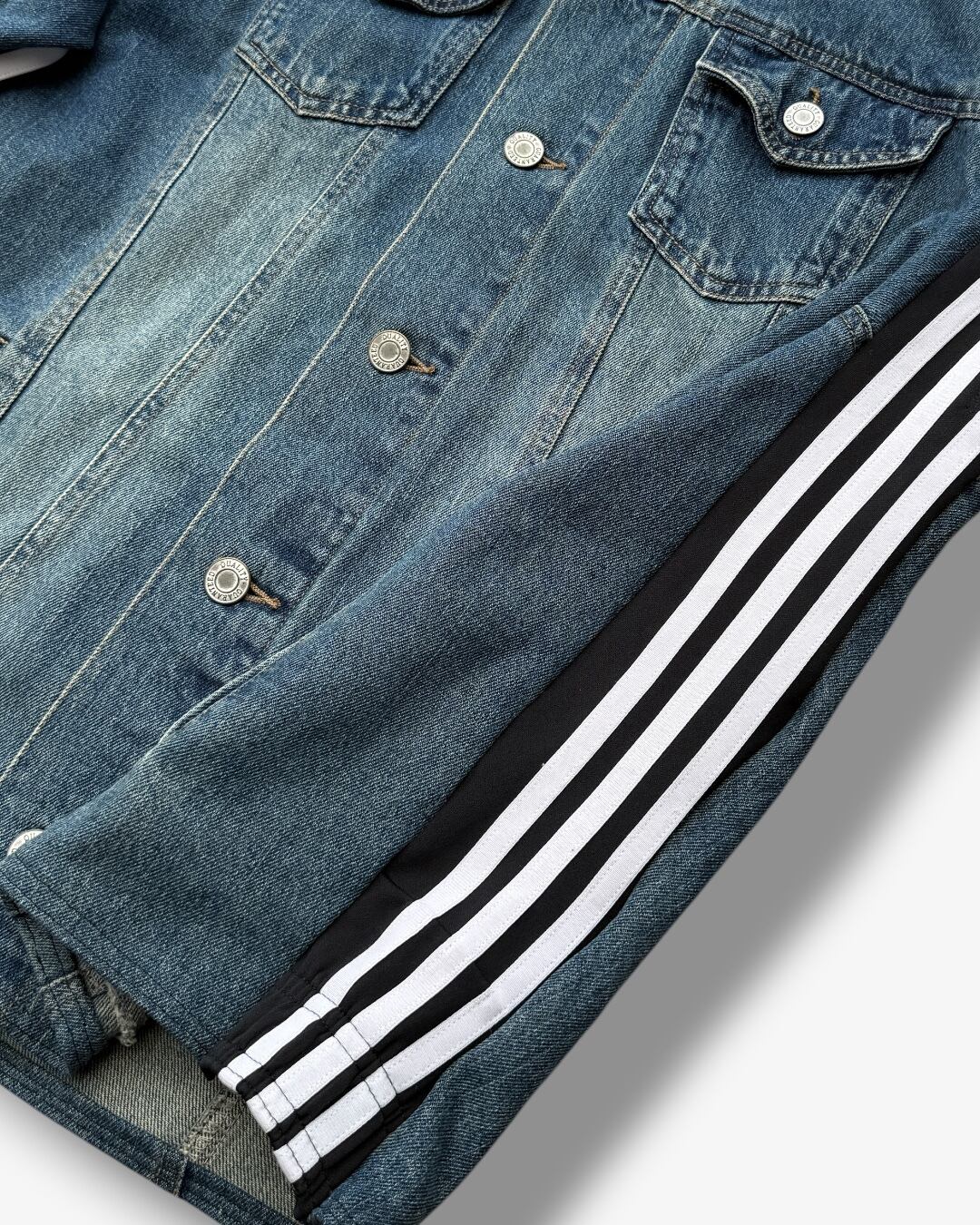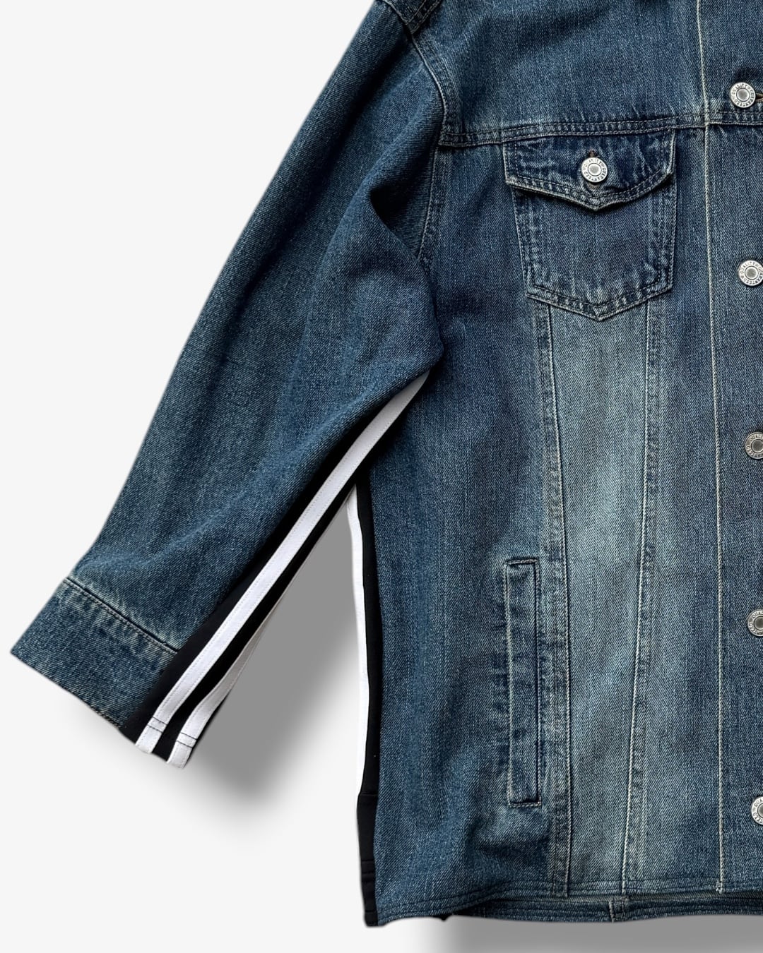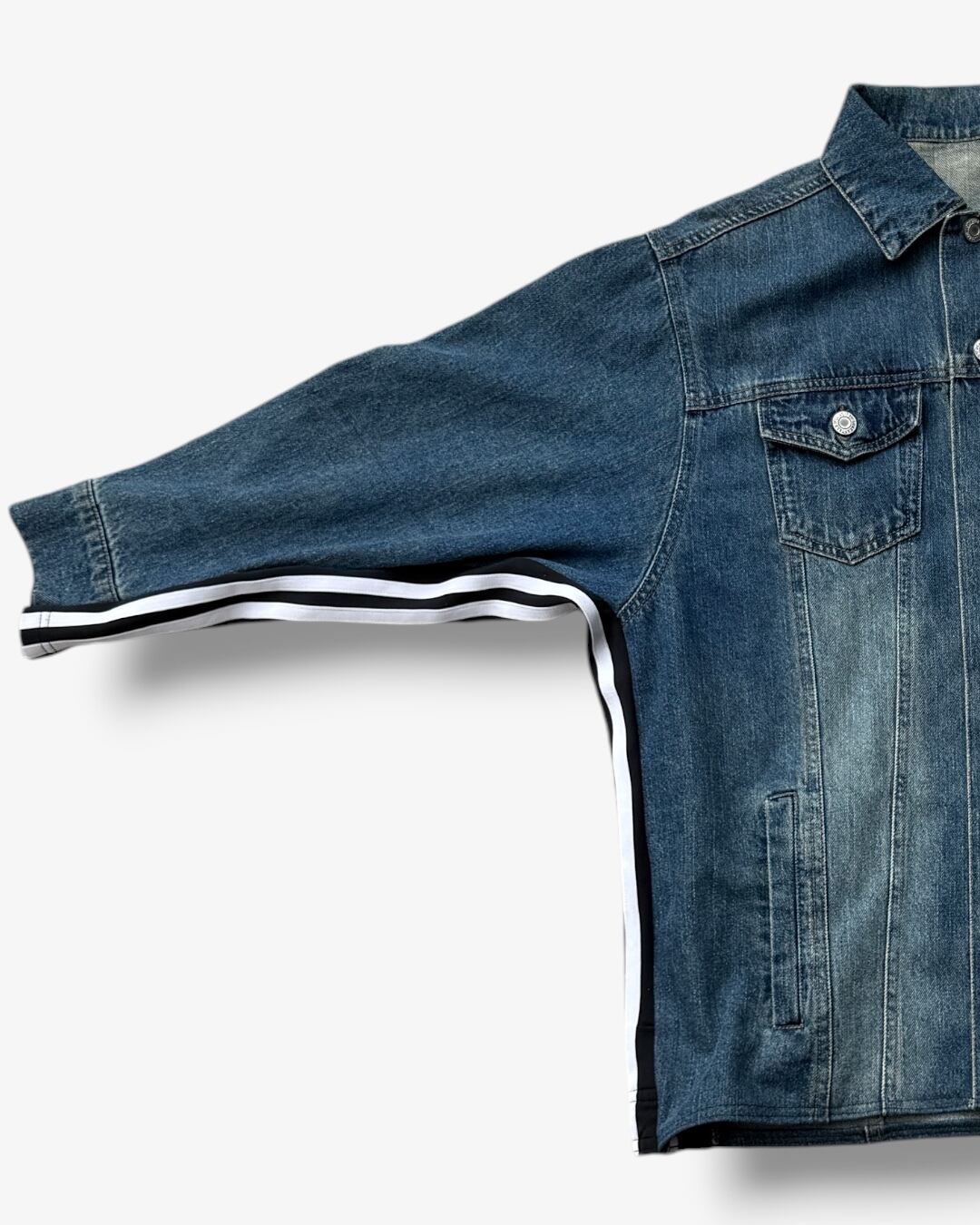 デニムジャケットにトラックパンツのサイドラインをドッキングした、スポーティーさとヴィンテージ感を融合させた一点物。