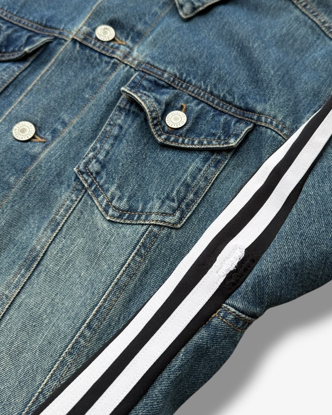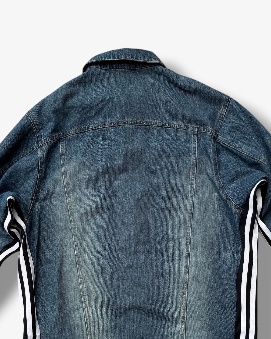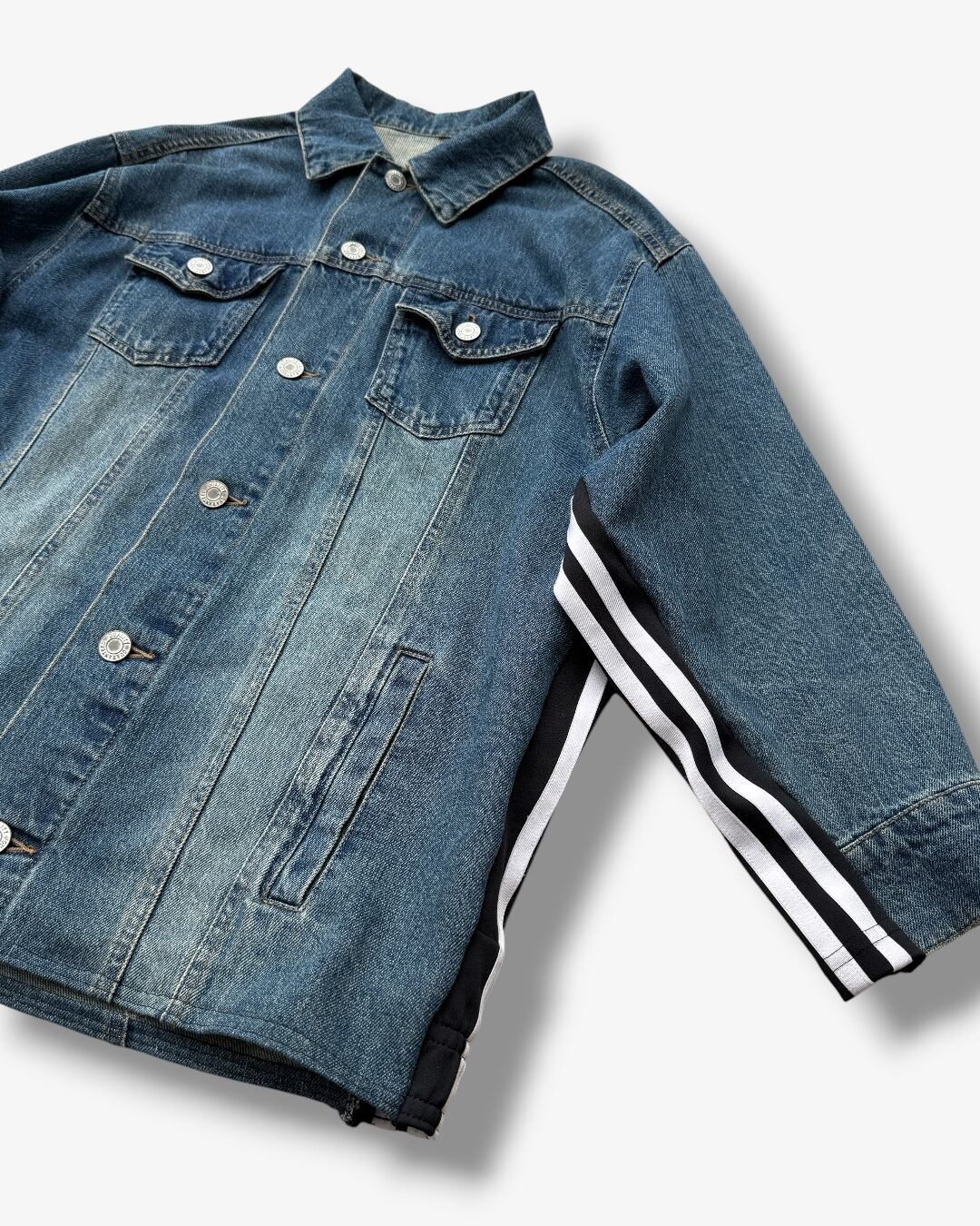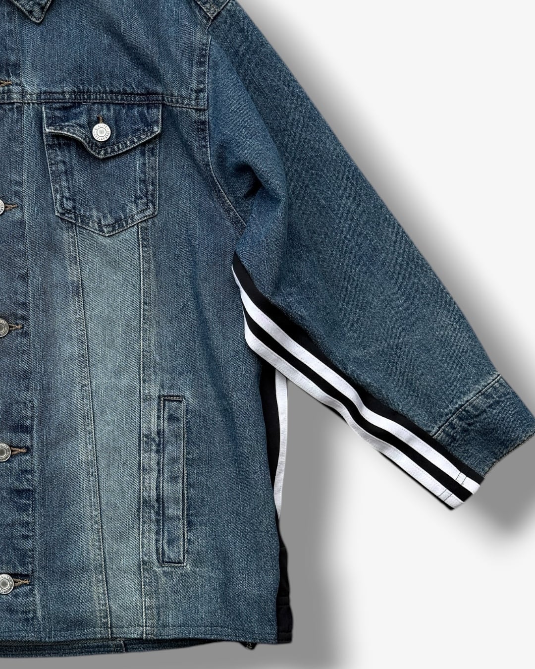 デニムジャケットにトラックパンツのサイドラインをドッキングした、スポーティーさとヴィンテージ感を融合させた一点物。