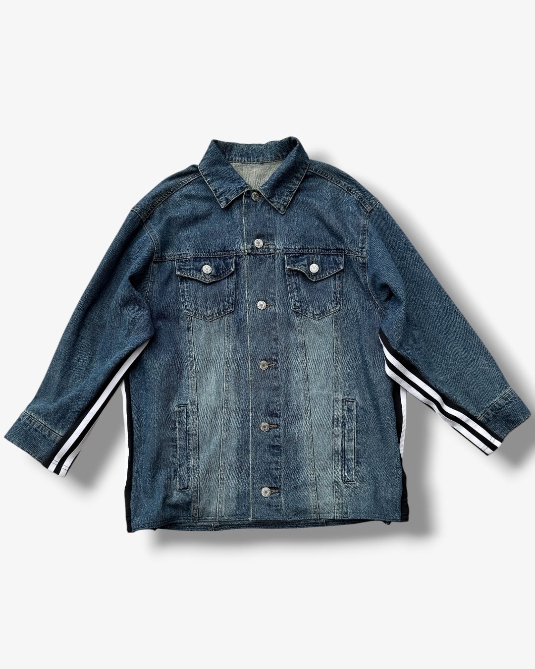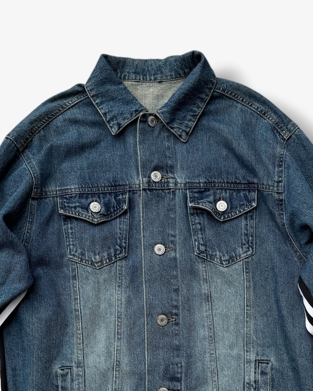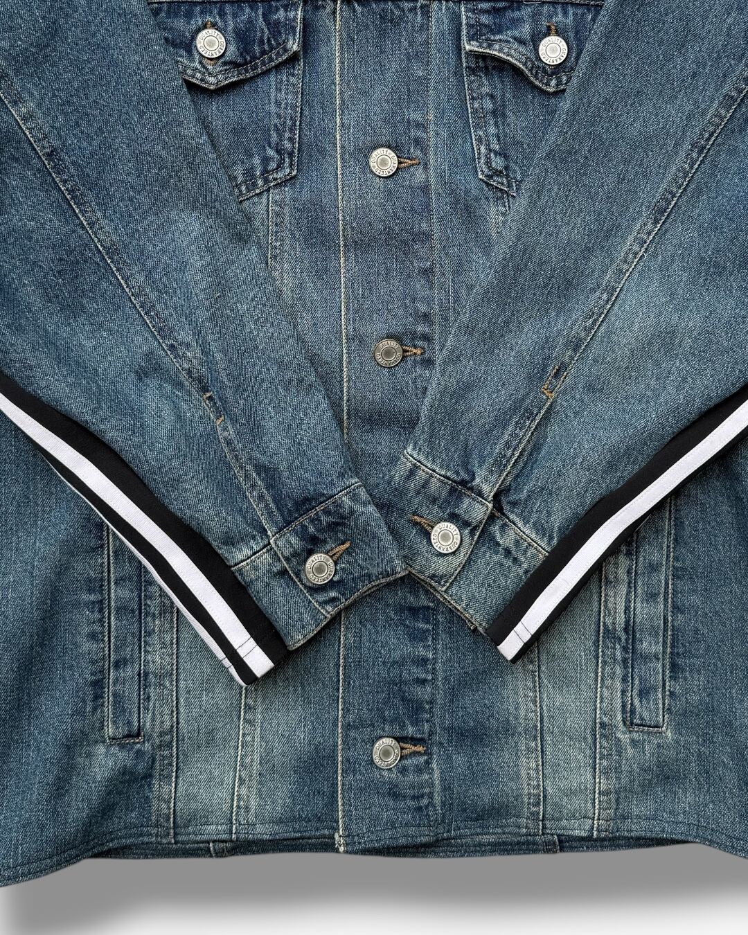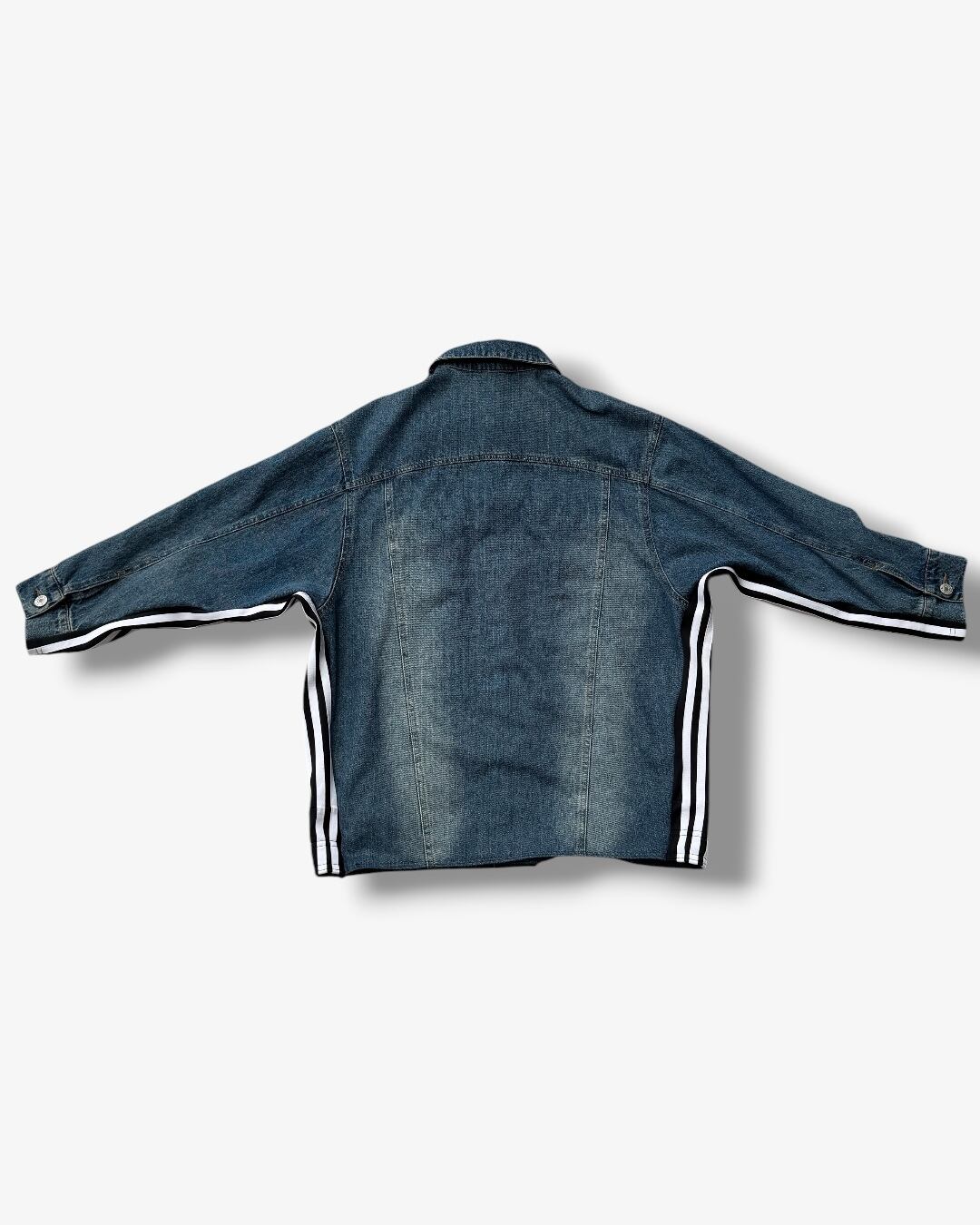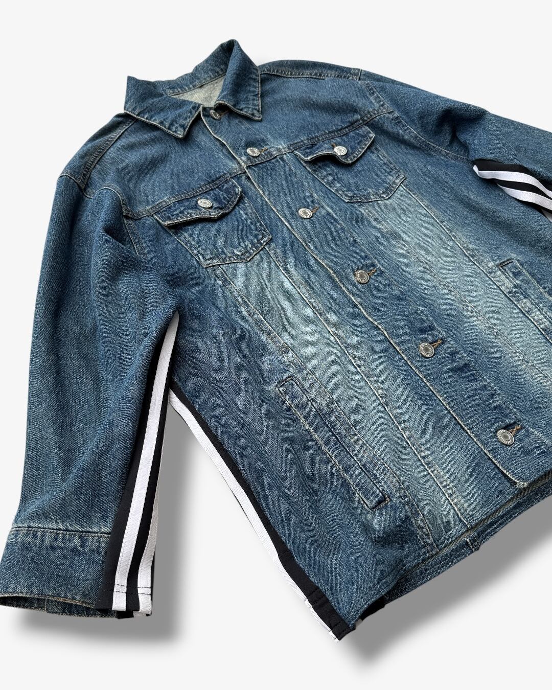 デニムジャケットにトラックパンツのサイドラインをドッキングした、スポーティーさとヴィンテージ感を融合させた一点物。