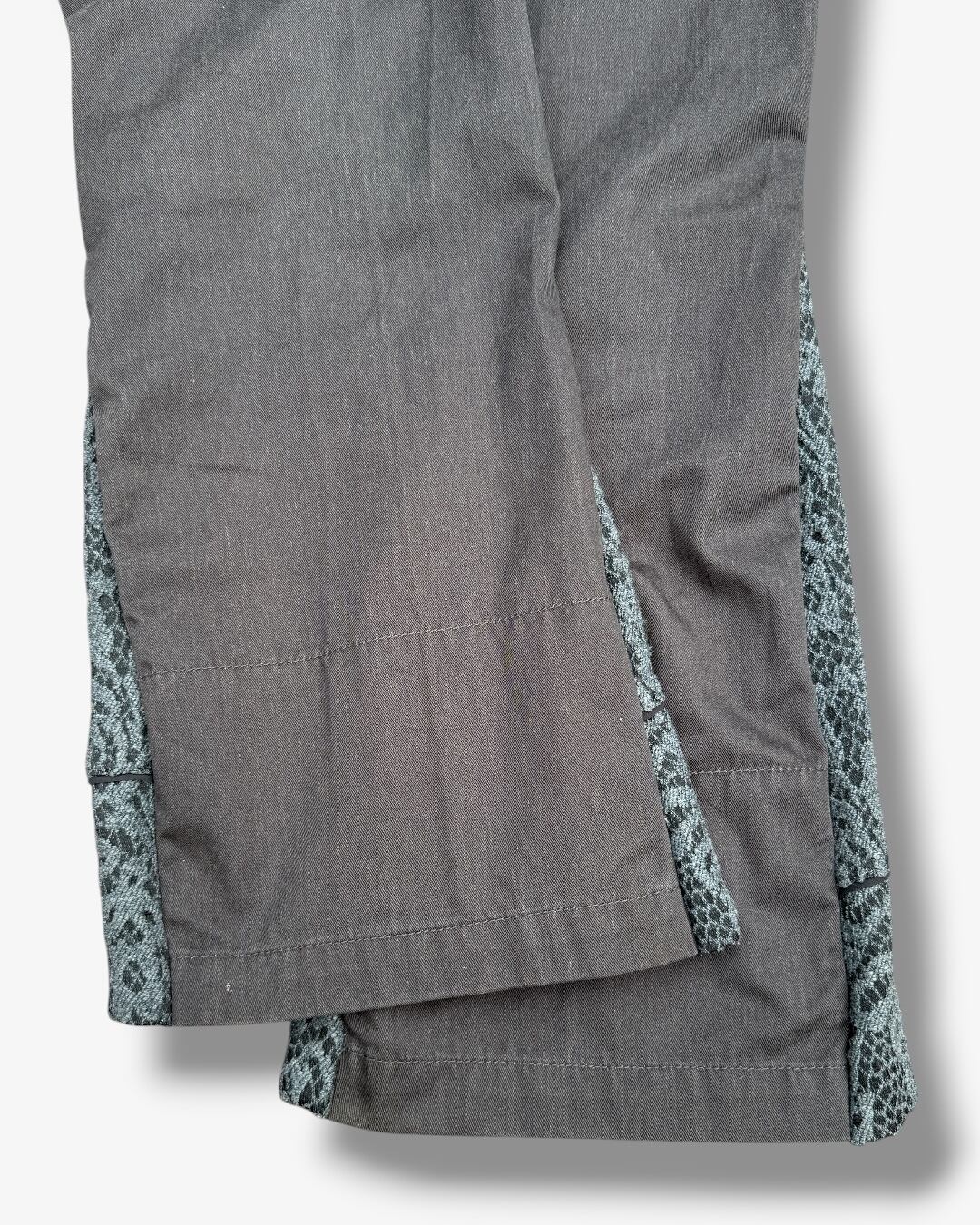 歩くたびに揺れるシルエットと、さりげなく覗く総柄生地が印象的な一本です。落ち着いたカラーリングで、個性的ながらも幅広いスタイリングに馴染みます。