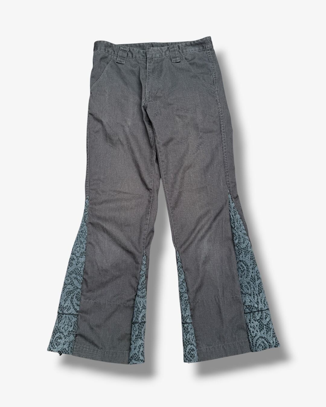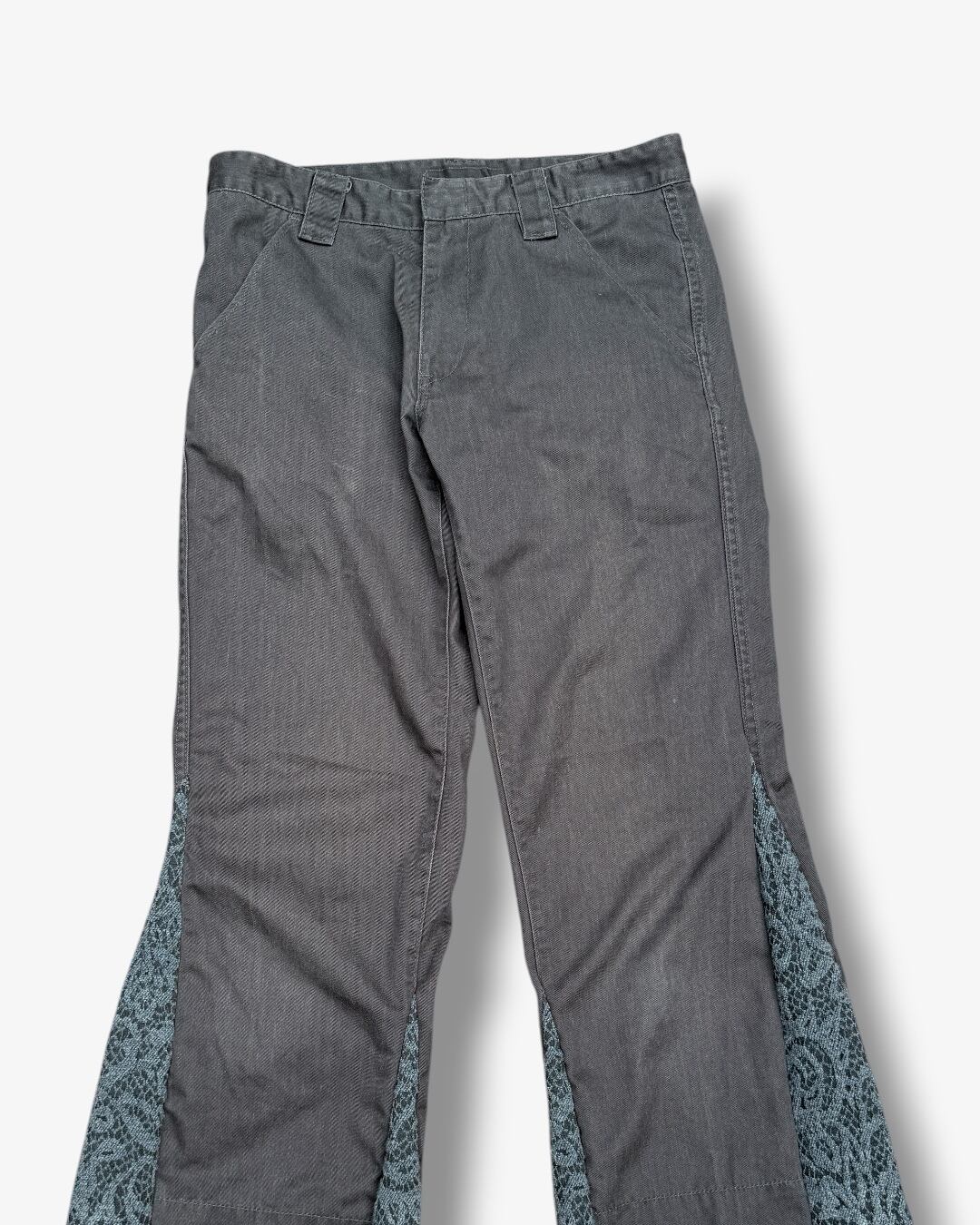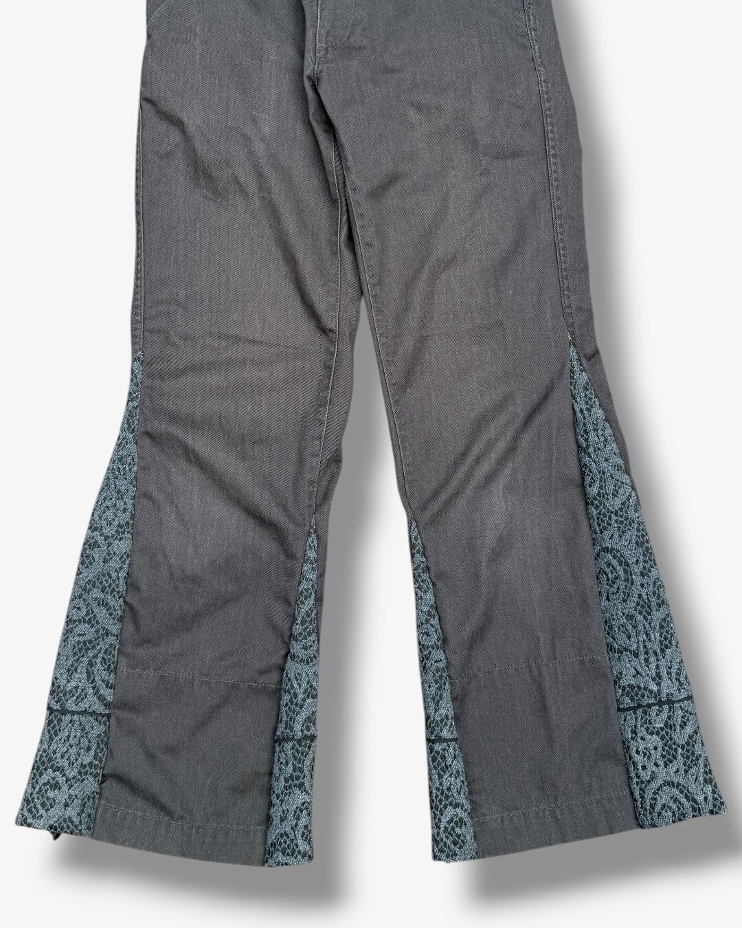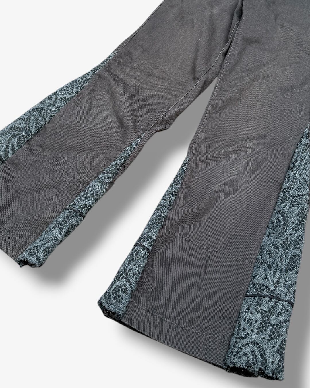 チノパンをベースに、スカート生地をサイドへドッキングしたリメイクフレアパンツ。